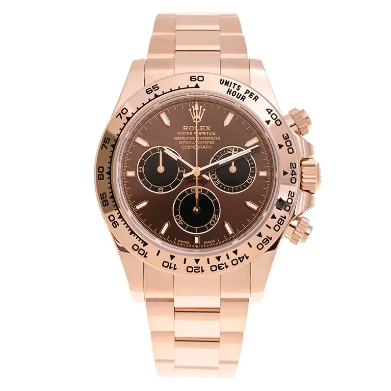 Die Rolex Daytona 126505 mit schokoladenfarbenem Zifferblatt kombiniert Everose-Gold mit einem warmen Braunton. Das Oyster-Armband unterscheidet diese Variante von der 126515LN mit Oysterflex und verleiht ihr einen klassischeren Charakter.