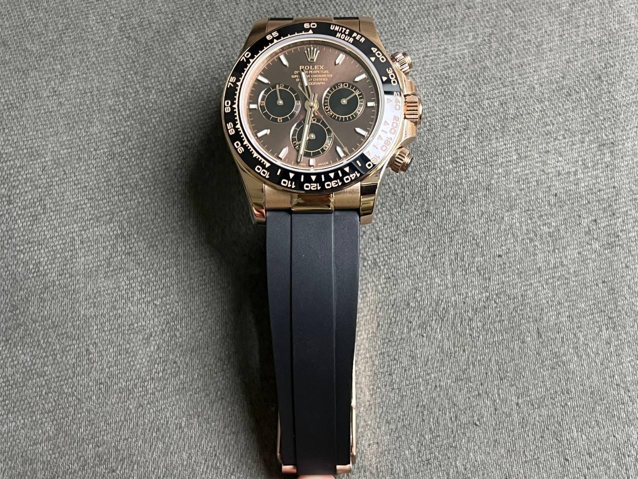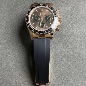 Die Rolex Daytona 126515LN mit schokoladenfarbenem Zifferblatt zeigt die warme Seite des Chronographen. Der satte Braunton harmoniert perfekt mit dem Everose-Gold und schafft ein stimmiges Gesamtbild.