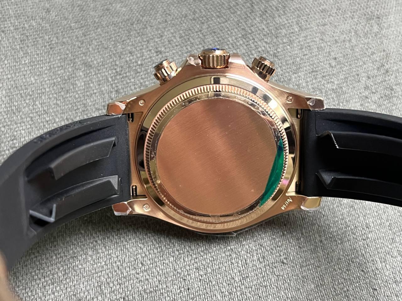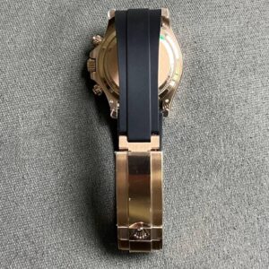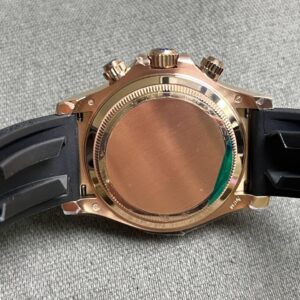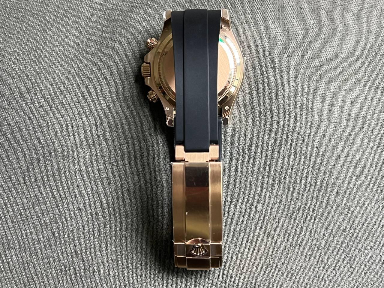 Das 40mm Gehäuse aus Everose-Gold, einer exklusiven Rolex-Legierung, behält seinen charakteristischen Rosé-Ton dauerhaft. Die schwarze Cerachrom-Lünette mit eingravierter Tachymeter-Skala bietet einen eleganten Kontrast. Verschraubte Drücker sichern die Wasserdichtigkeit bis 100 Meter.