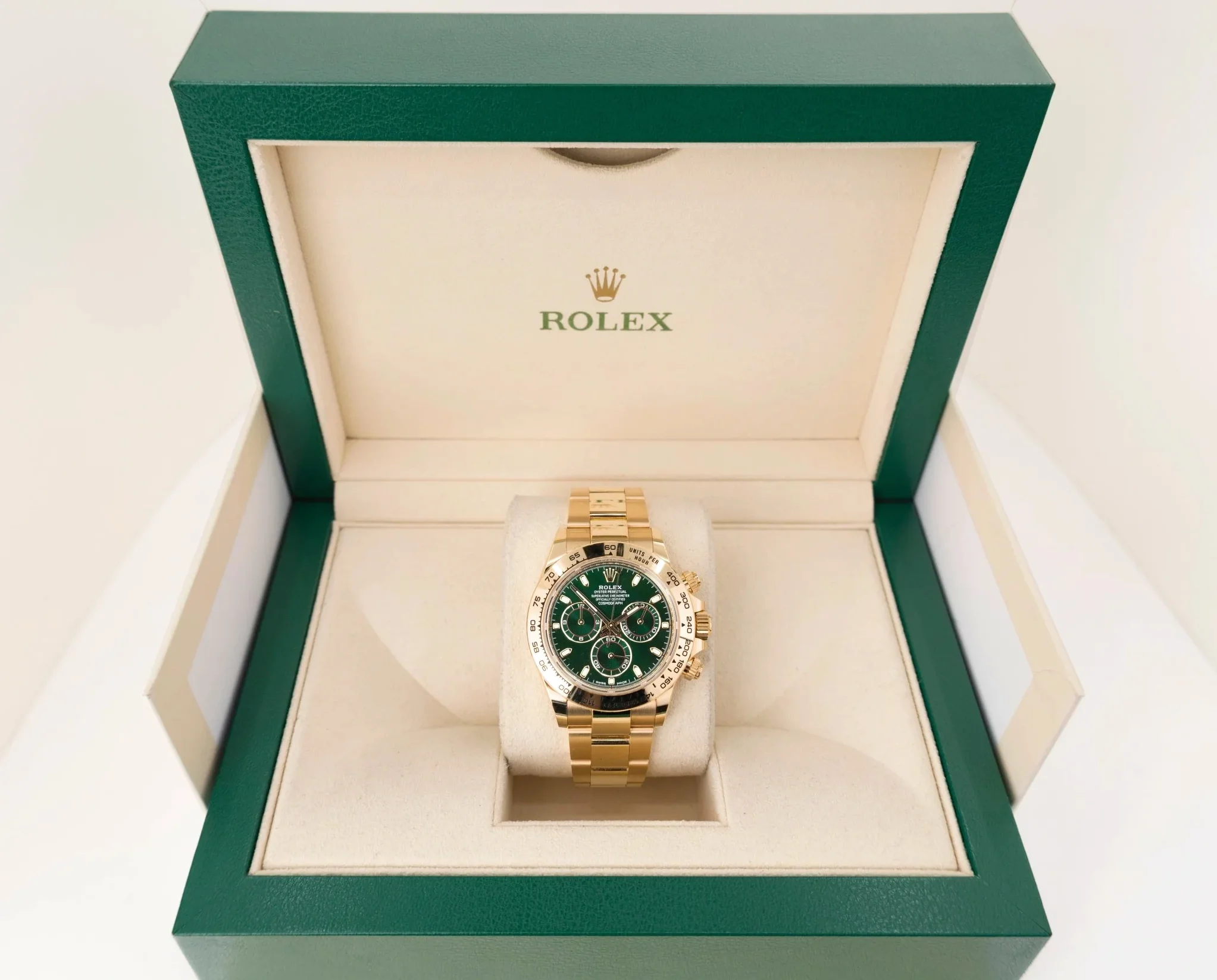 Die Rolex Daytona 116508 mit dem Spitznamen John Mayer zeigt das begehrte grüne Zifferblatt in Gelbgold. Das 40mm-Gehäuse aus 18 Karat Gelbgold trägt eine goldene Tachymeter-Lünette. Das satte Grün des Zifferblatts ist eine der seltensten Farbvarianten.