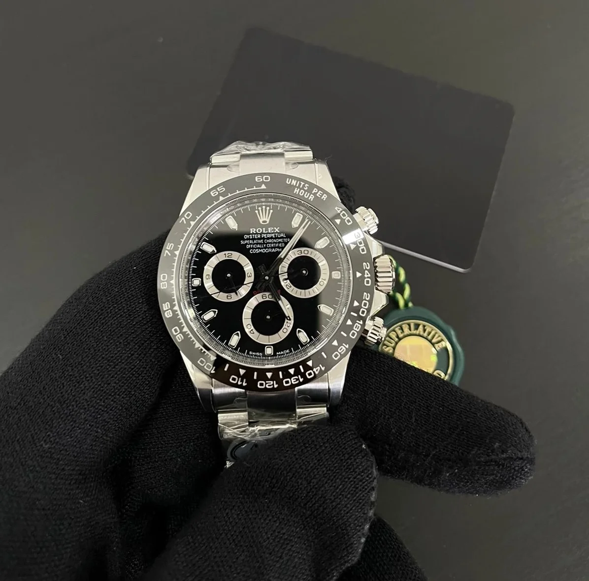Rolex Daytona 116500LN Reverse Panda mit schwarzem Zifferblatt und weißen Totalisatoren. 40mm Edelstahl, Cerachrom-Lünette.