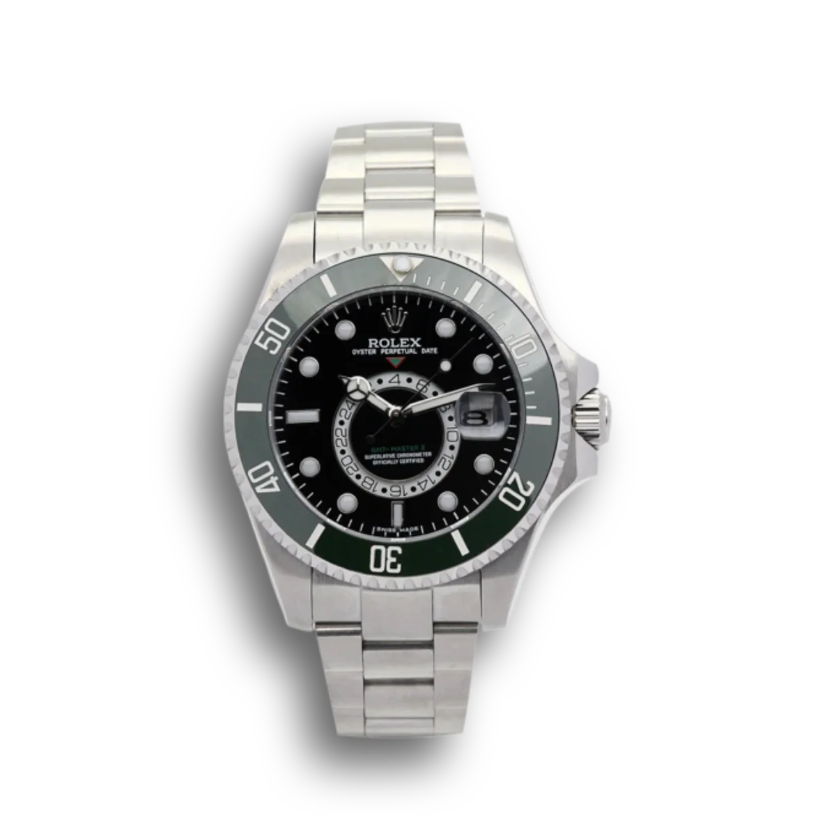 Das Oyster-Armband im Design der 1990er Jahre schließt mit einer Faltschließe. Die Wasserdichtigkeit bis 100 Meter macht die Uhr zum vielseitigen Alltagsbegleiter für Geschäftsreisende.
