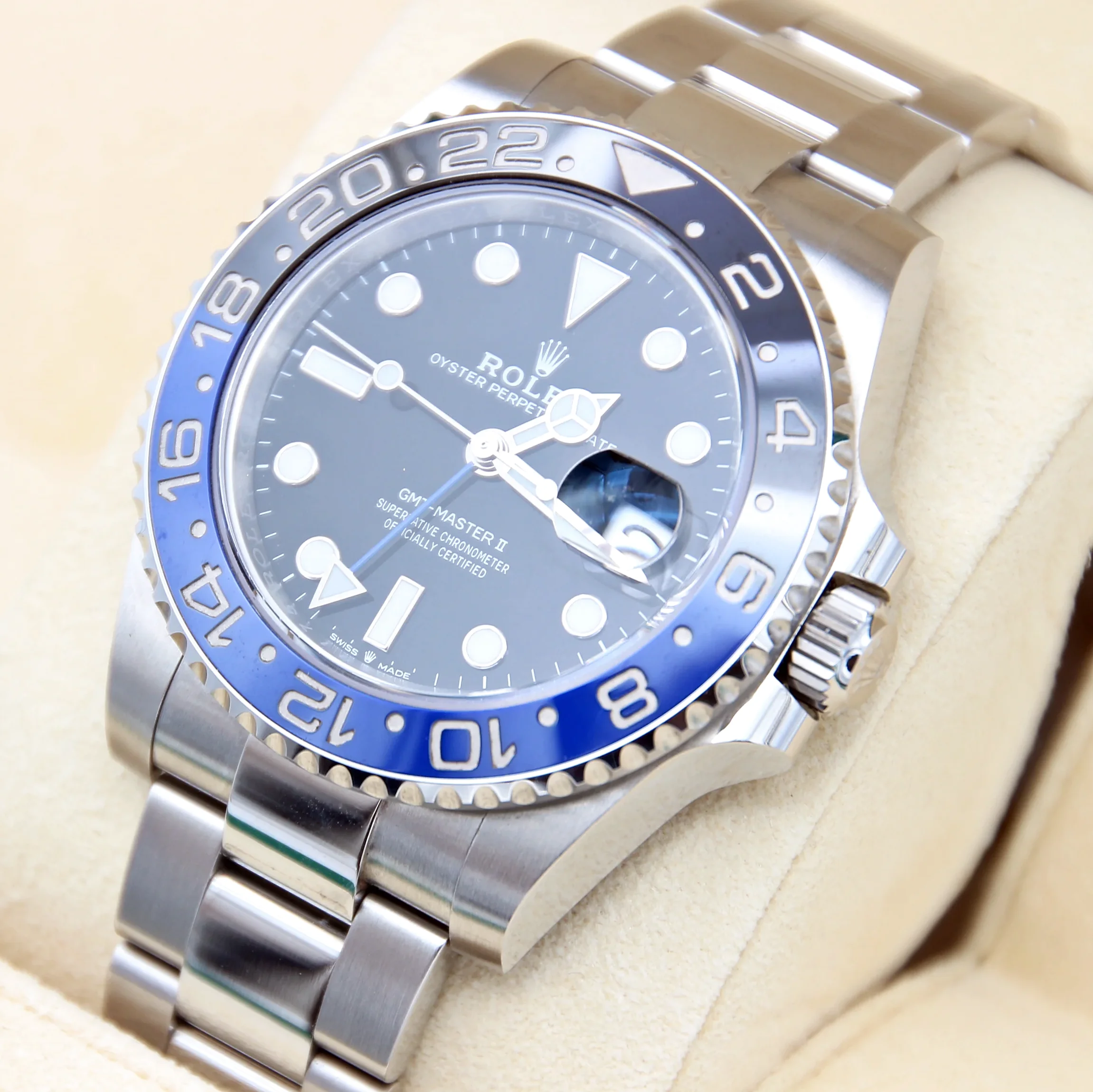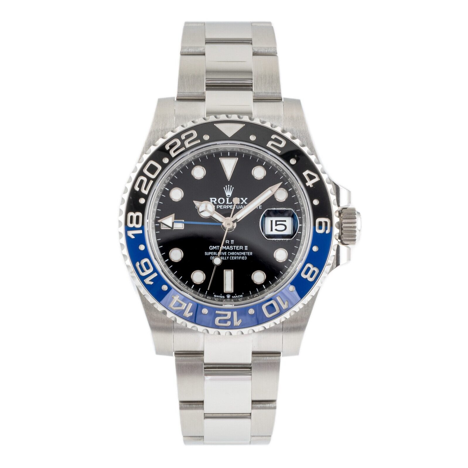 Die Rolex GMT-Master II 126710BLNR „Batman“ mit Jubilee-Armband kombiniert die beliebte blau-schwarze Lünette mit dem eleganten fünfgliedrigen Band. Diese Variante wird auch „Batgirl“ genannt.