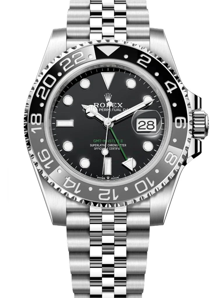 Die Referenz 126710GRNR wurde 2024 vorgestellt und erweitert das GMT-Master-Portfolio um eine dezentere Farbvariante. Ideal für Träger, die eine Weltzeituhr ohne auffällige Lünettenfarben bevorzugen.