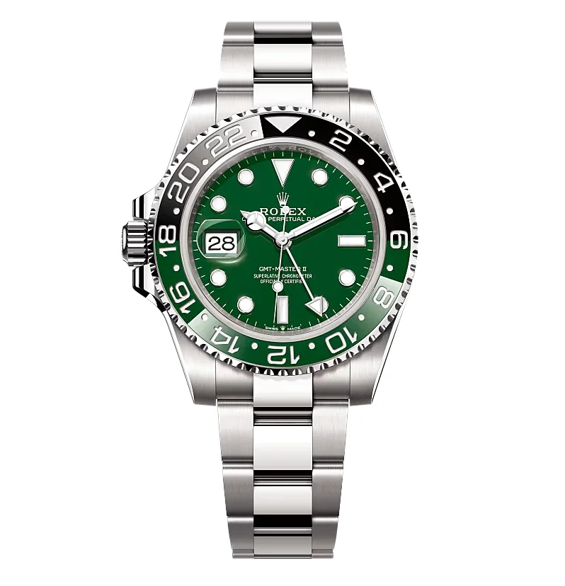 Die Rolex GMT-Master II 126729VTNR „Absinth“ kombiniert die grün-schwarze Sprite-Lünette mit einem Gehäuse aus 18 Karat Weißgold. Das Ergebnis ist eine der exklusivsten GMT-Master II Varianten überhaupt.