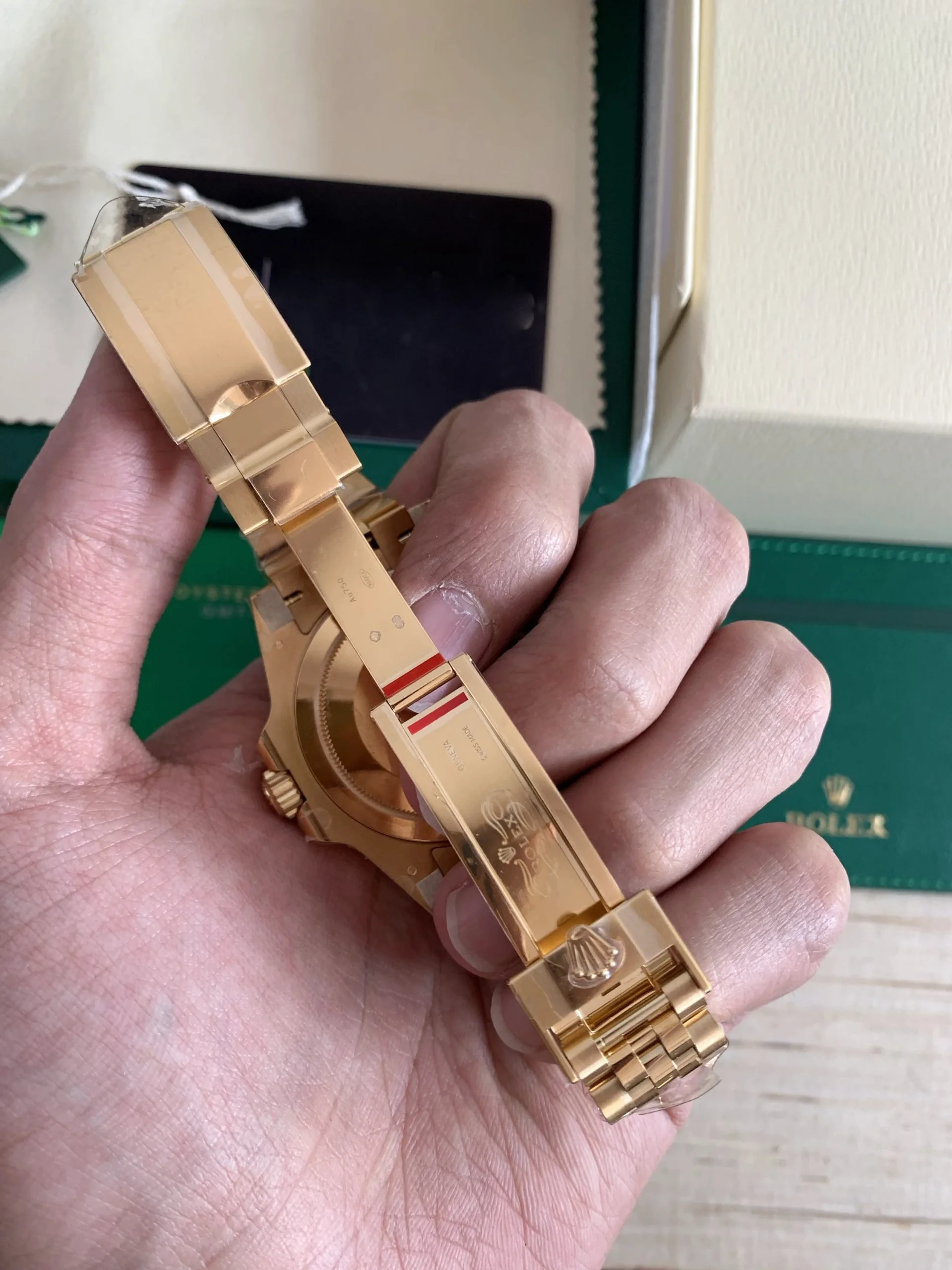 Das Oyster-Armband aus 18K Gelbgold mit Oysterclasp-Sicherheitsfaltschließe und Easylink-Komfortverlängerung bietet perfekten Tragekomfort. Die Wasserdichtigkeit bis 100 Meter macht diese Uhr alltagstauglich.