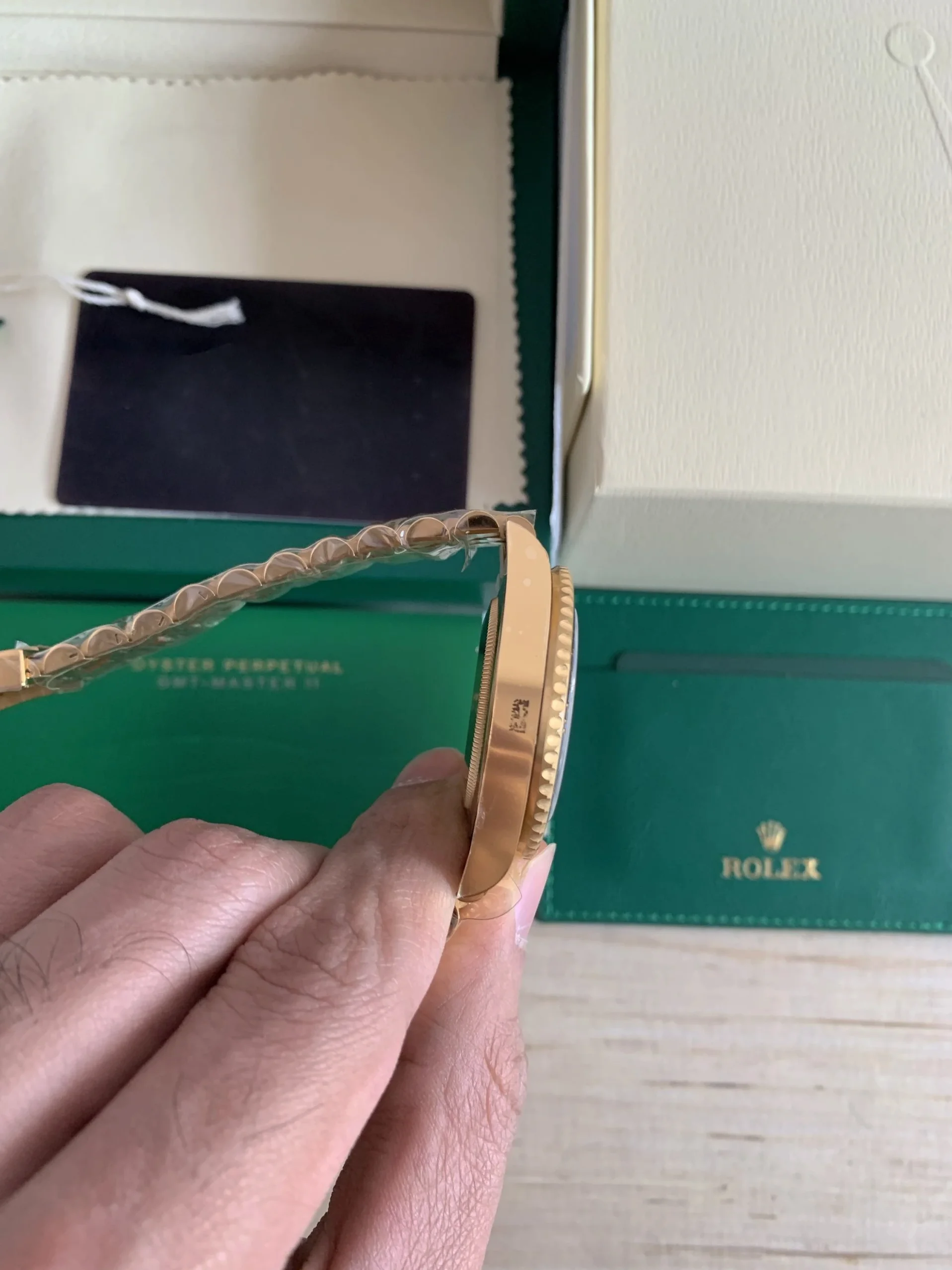 Die 126718GRNR verkörpert die Quintessenz der GMT-Master II in Gold. Die dezente grau-schwarze Lünette verleiht dem klassischen Goldmodell einen modernen, zurückhaltenden Charakter.