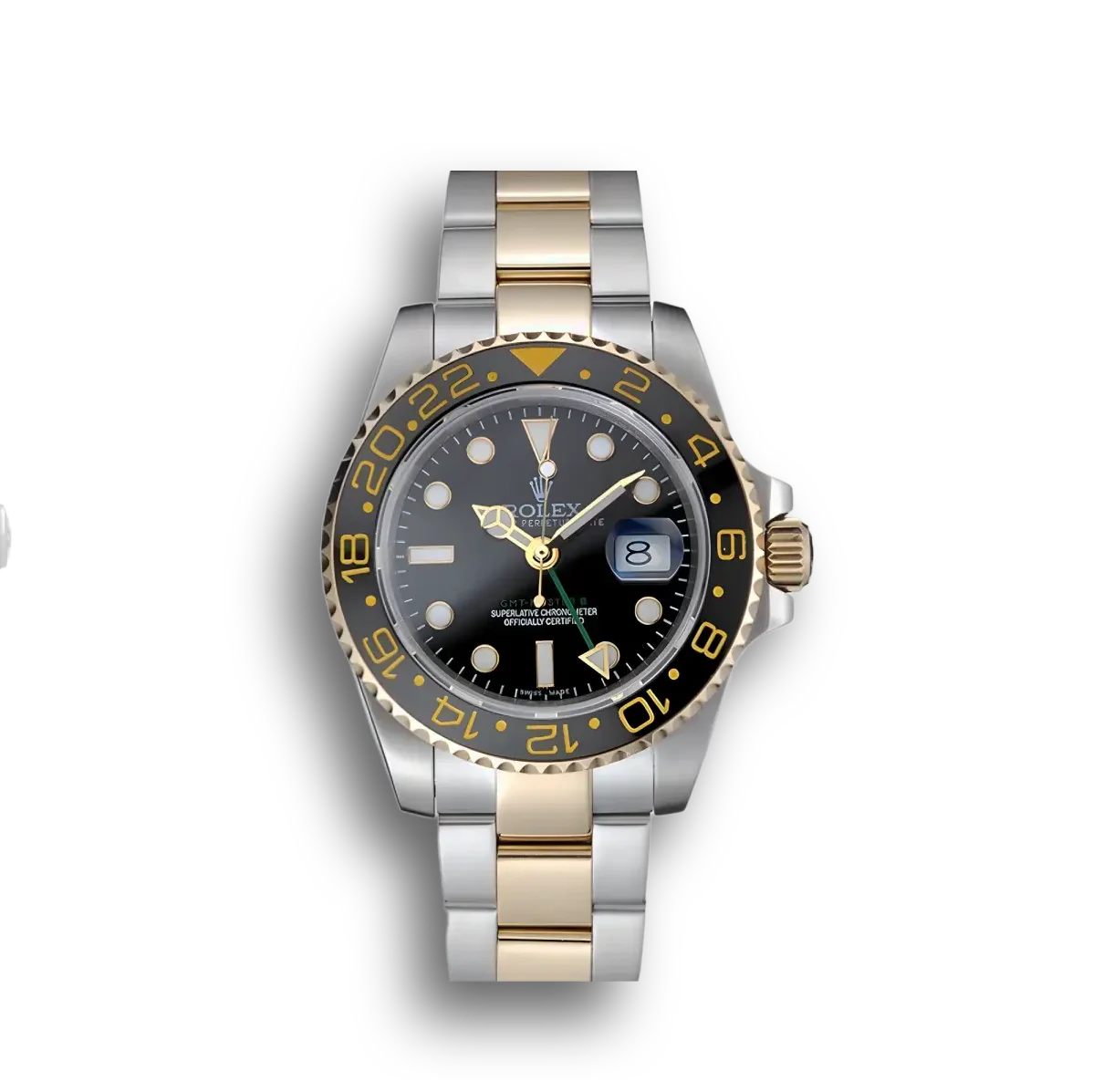 Die Rolex GMT-Master II 116713LN kombiniert Oystersteel mit 18 Karat Gelbgold zu einem eleganten Bicolor-Design. Die schwarze Cerachrom-Lünette bildet einen starken Kontrast zu den goldenen Gehäuseelementen.