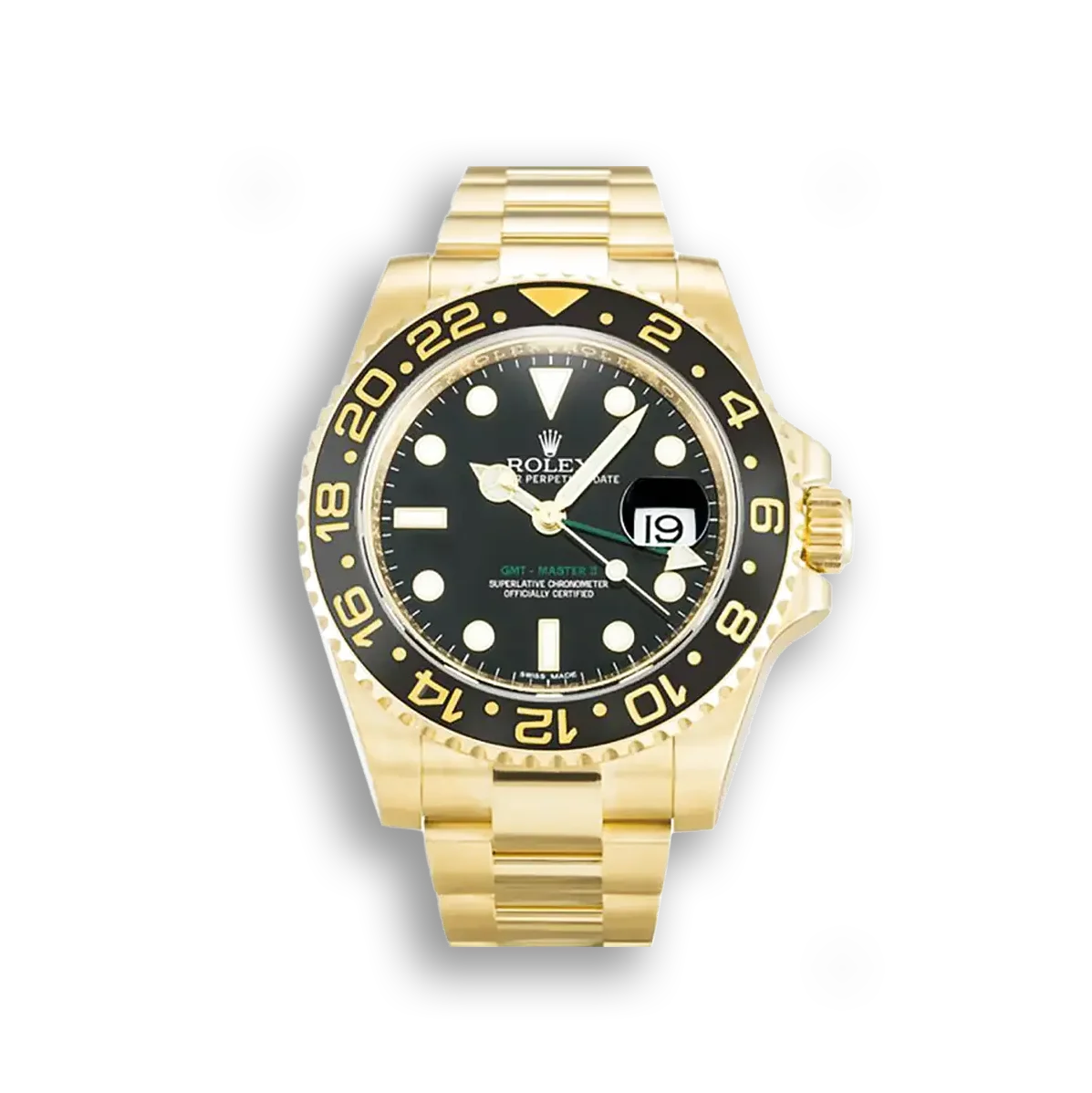 Das 40mm Gehäuse aus massivem Gelbgold trägt eine bidirektional drehbare 24-Stunden-Lünette. Die Keramikeinlage ist praktisch kratzfest und behält ihre tiefschwarze Farbe dauerhaft. Der grüne GMT-Zeiger setzt einen farblichen Akzent.