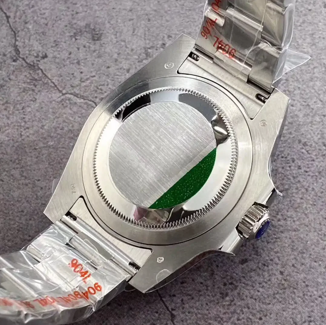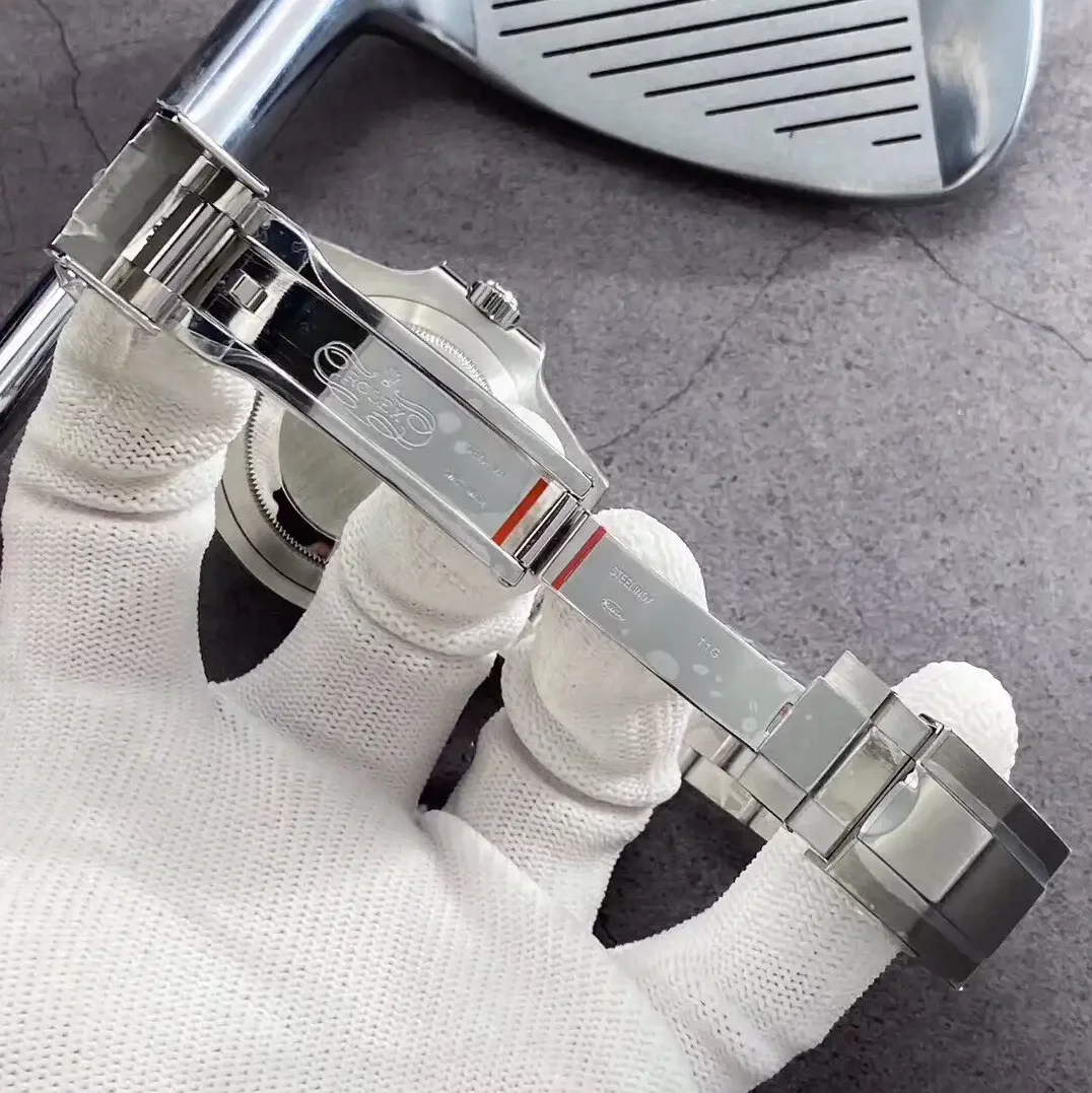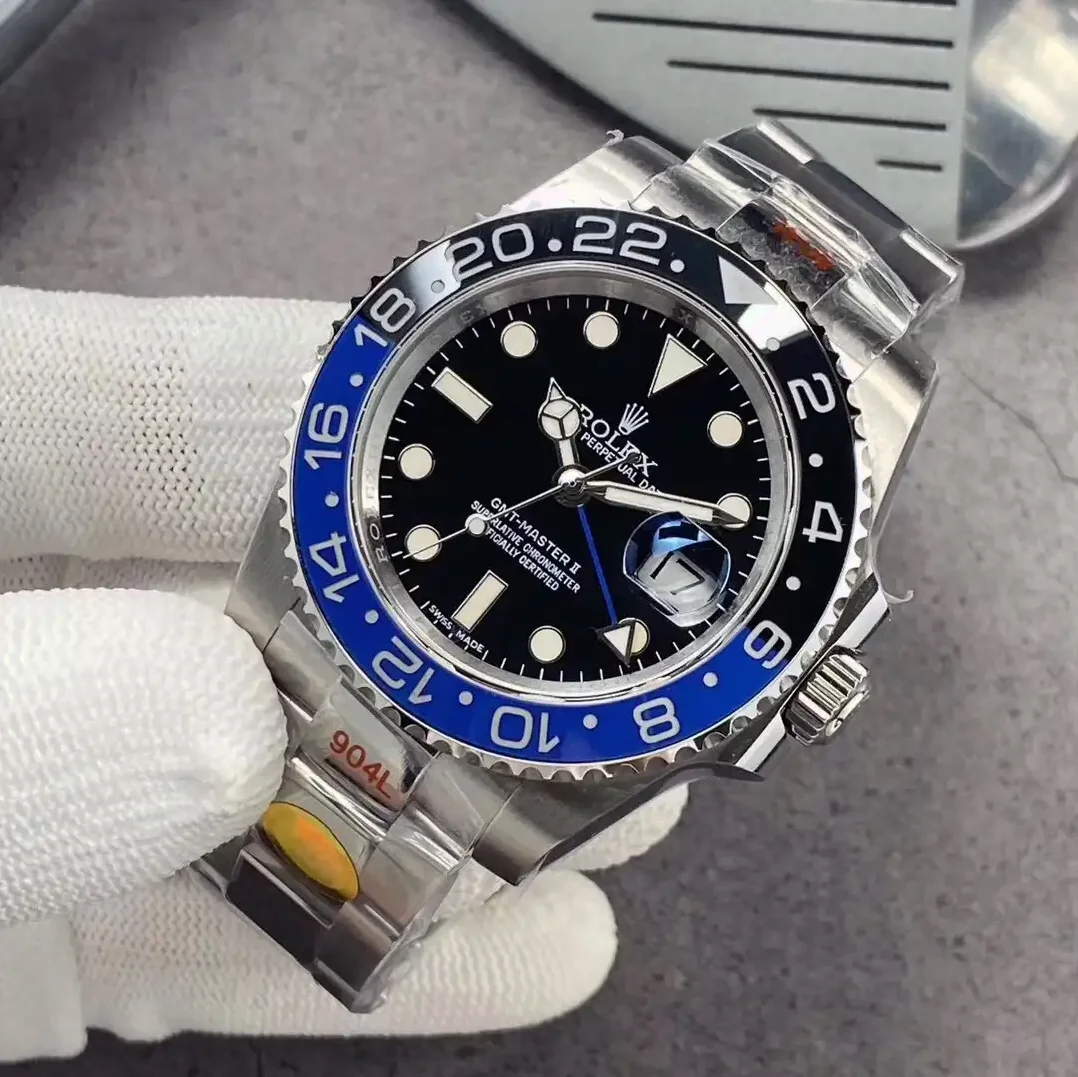 Das 40mm Oystersteel-Gehäuse trägt die bidirektional drehbare Cerachrom-Lünette. Die Herstellung zweifarbiger Keramik war lange Zeit eine technische Herausforderung, die Rolex 2018 erstmals bei der Pepsi-Variante meisterte.