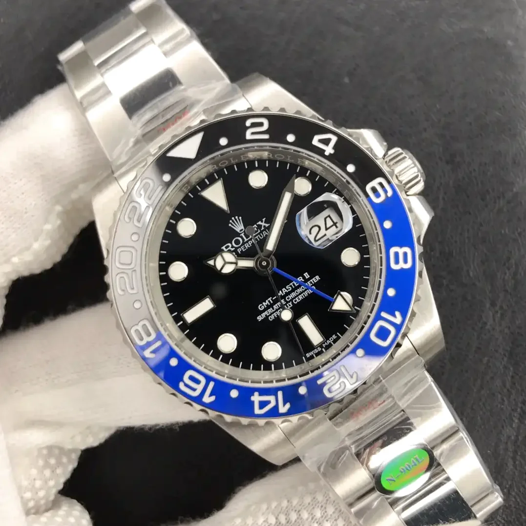 Die Rolex GMT-Master II 126710BLNR mit Oyster-Armband zeigt die sportlichere Interpretation des Batman-Designs. Das robuste Metallarmband bietet maximale Widerstandsfähigkeit für den täglichen Einsatz.