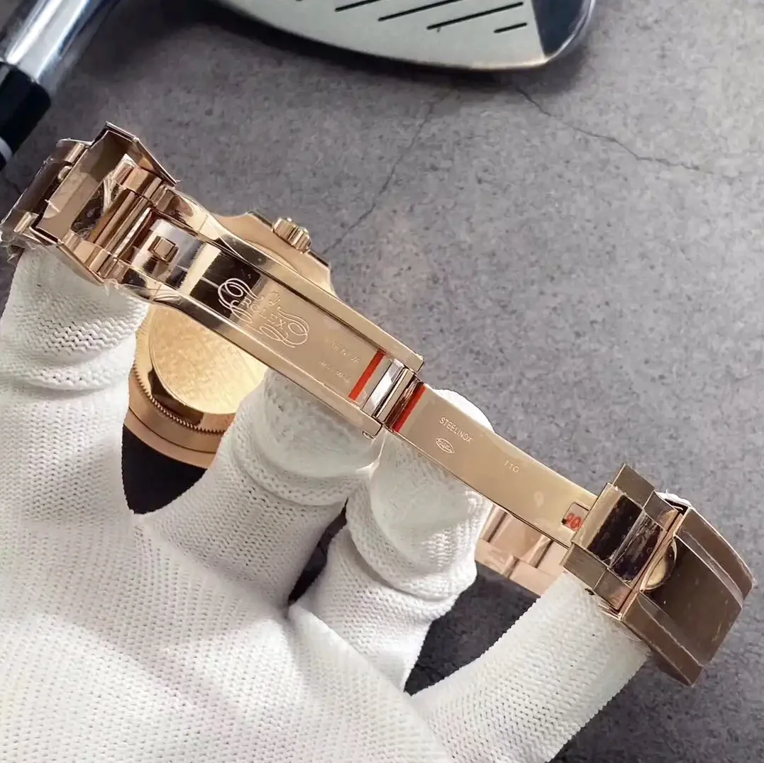 Das 40mm Gehäuse kombiniert Oystersteel mit 18 Karat Everose-Gold. Die Lünette, Krone und Mittelglieder des Armbands sind aus dem roségoldenen Edelmetall gefertigt. Die Cerachrom-Einlage zeigt die 24-Stunden-Skala.