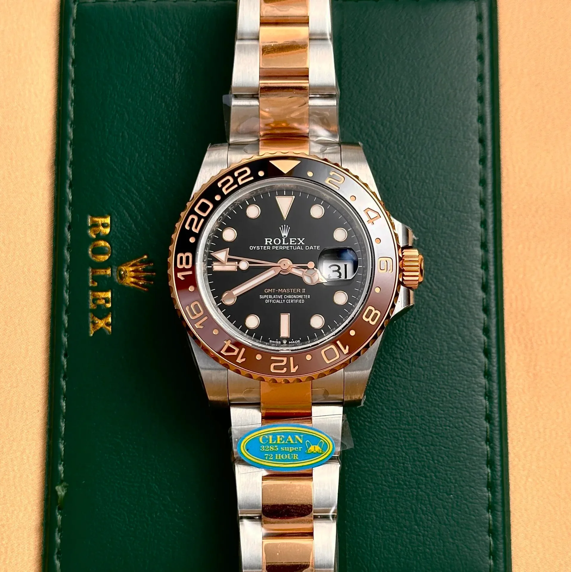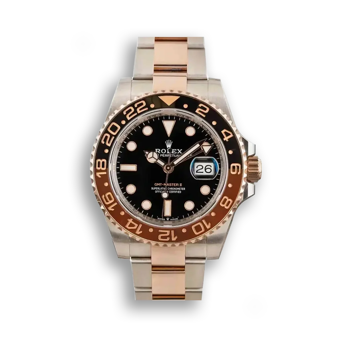 Die Rolex GMT-Master II 126711CHNR „Root Beer“ kombiniert Oystersteel mit Everose-Gold zu einem warmen Bicolor-Design. Die braun-schwarze Cerachrom-Lünette verleiht der Uhr ihren charakteristischen Spitznamen.