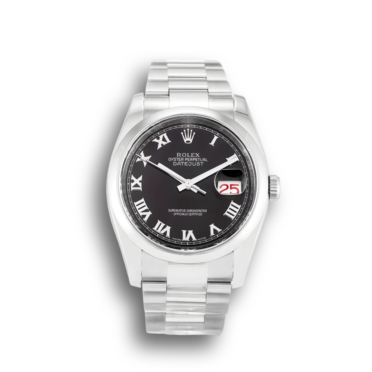 Diese Datejust 116200 in Schwarz ist die puristische Wahl für Träger, die klare Kontraste und sachlichen Stil schätzen.
