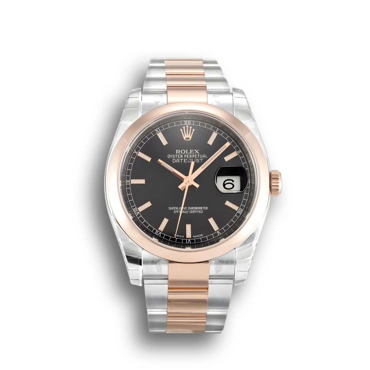 Die Rolex Datejust 116201 vereint Edelstahl mit 18 Karat Roségold. Das schwarze Zifferblatt kontrastiert wirkungsvoll mit den warmen Roségold-Akzenten. Eine moderne Bicolor-Interpretation.