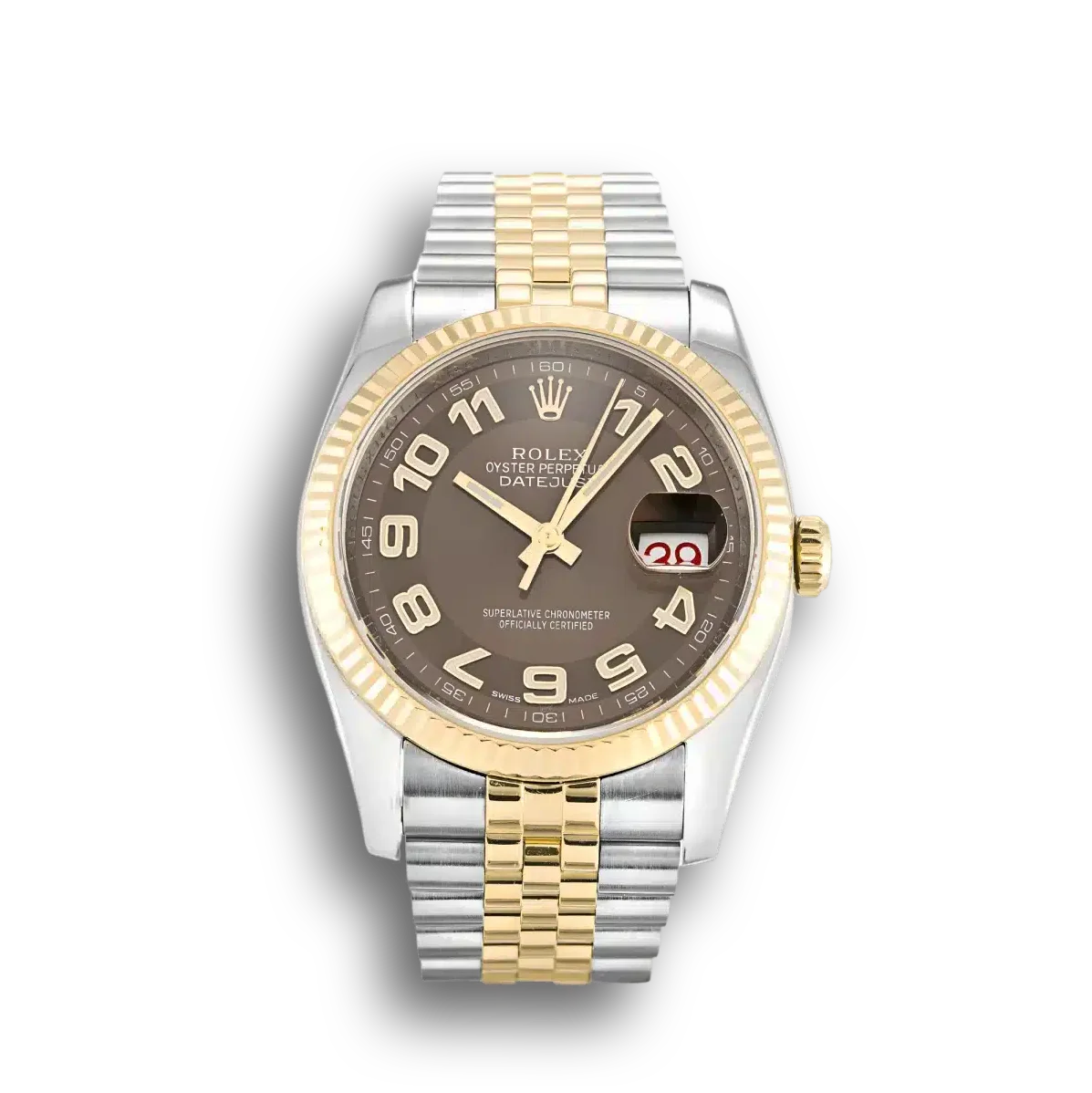 Die Rolex Datejust 116233 mit bronzefarbenem Zifferblatt zeigt einen warmen, erdigen Ton. Das Bicolor-Gehäuse aus Stahl und 18 Karat Gelbgold harmoniert perfekt mit diesem ungewöhnlichen Farbton.