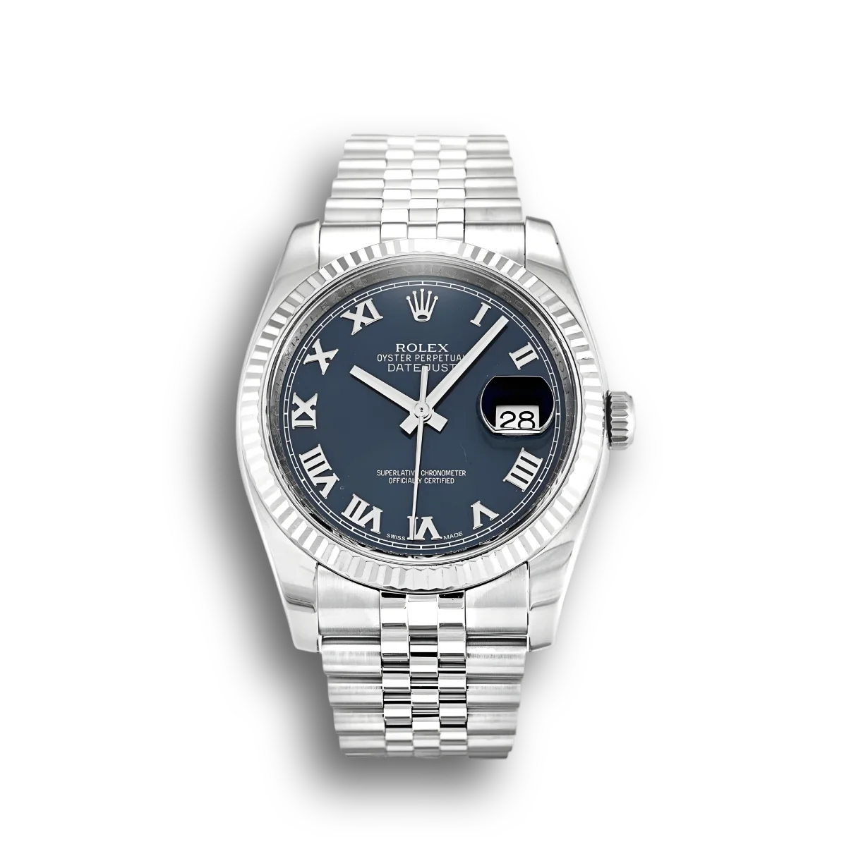 Diese Datejust 116234 in Blau eignet sich für Träger, die dezenten Luxus mit Farbakzent suchen. Die Weißgold-Lünette hebt die Uhr von reinen Stahlmodellen ab.