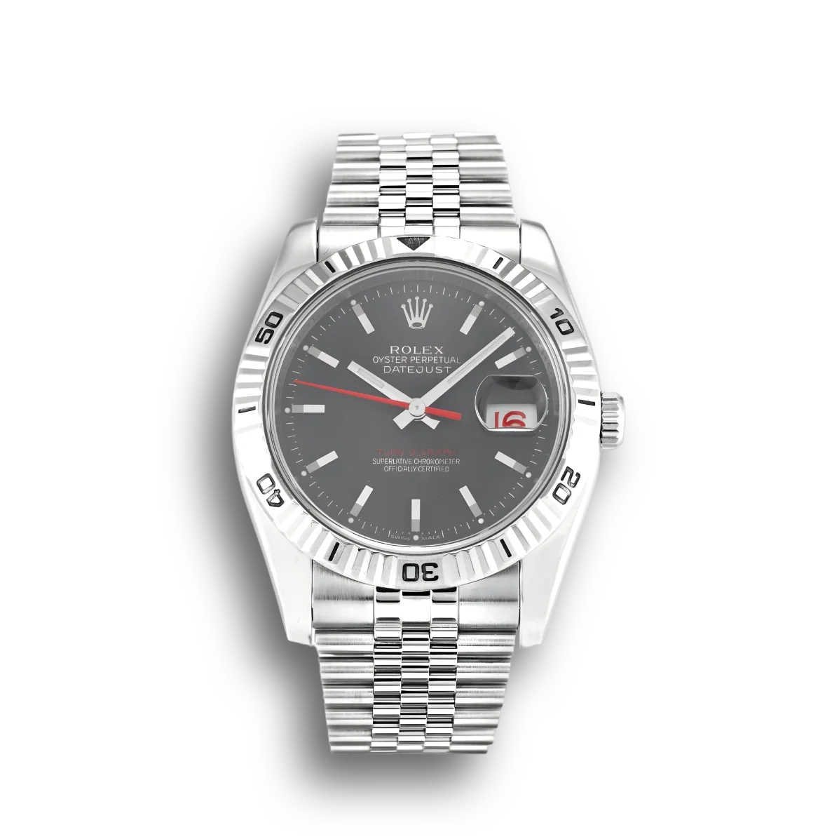 Die Rolex Datejust 116264 Turn-O-Graph zeichnet sich durch ihre drehbare Weißgold-Lünette aus. Diese Funktion stammt aus der Fliegeruhren-Tradition und ermöglicht das Messen von Zeitintervallen. Ein sportlicher Akzent in der Datejust-Familie.