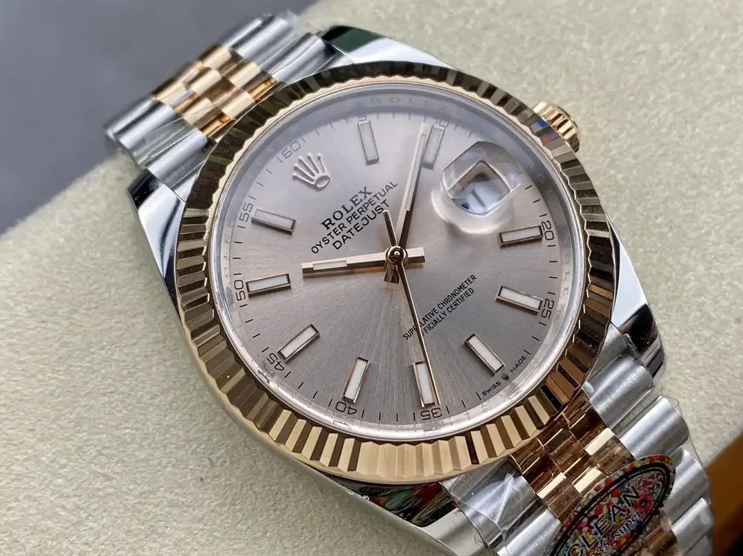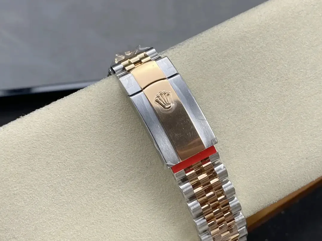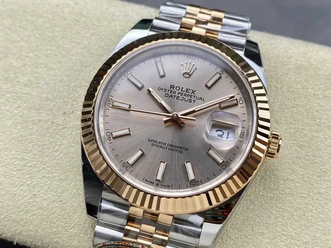 Diese Datejust 126331 in Roségold-Tönen eignet sich für Herren, die warme Bicolor-Eleganz in großem Format suchen.