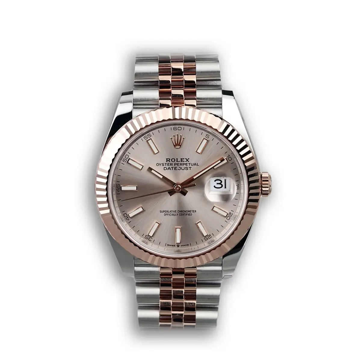 Die Rolex Datejust 126331 mit roségoldenem Zifferblatt vereint Oystersteel mit 18 Karat Everose-Gold. Das 41mm Gehäuse bietet markante Präsenz. Die warmen Roségold-Töne durchziehen das gesamte Design.