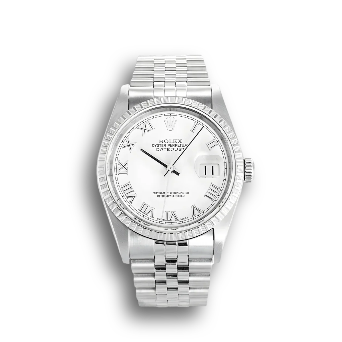 Die Rolex Datejust 16220 präsentiert sich in purem Edelstahl mit weißem Zifferblatt. Diese 36mm Referenz verzichtet auf Goldakzente und wirkt dadurch sportlich-sachlich. Die glatte Stahllünette unterstreicht den reduzierten Charakter.