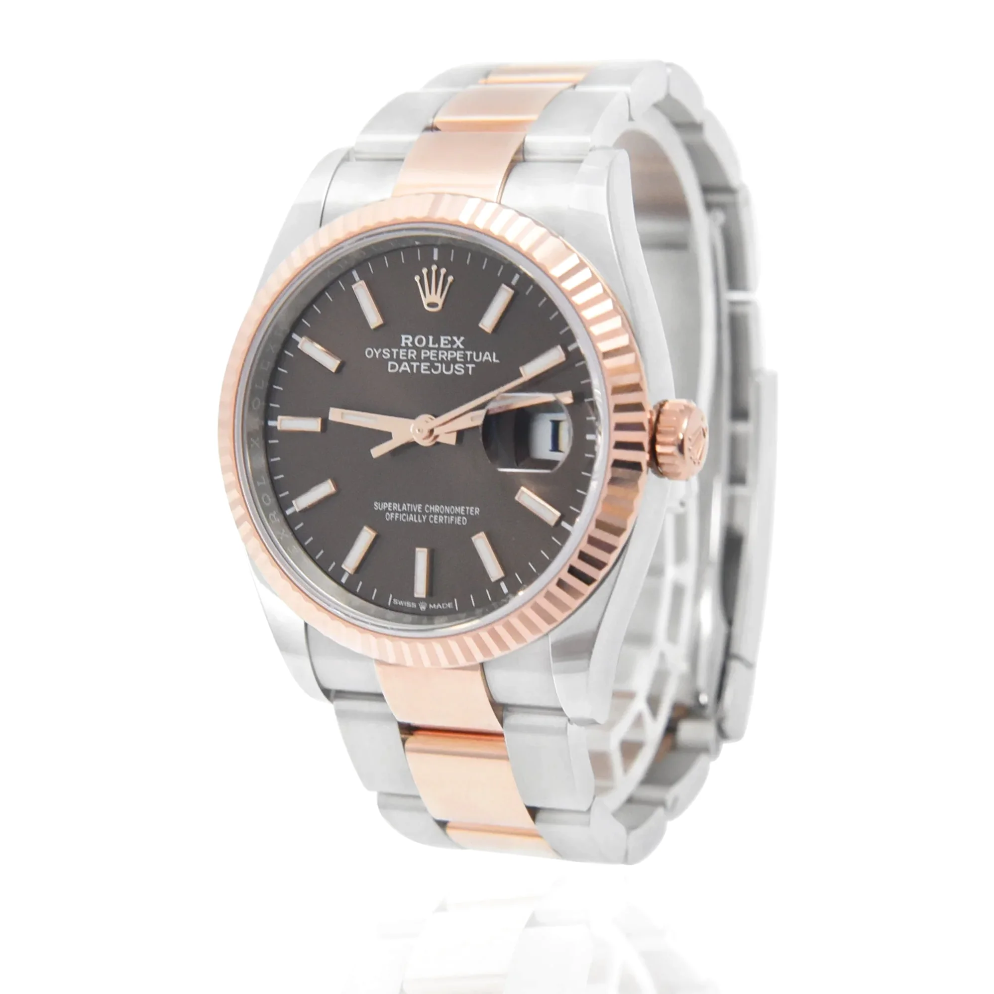 Die Rolex Datejust 126231 mit schokoladenbraunem Zifferblatt und geriffelter Roségold-Lünette zeigt die klassische Datejust-Optik. Oystersteel und 18 Karat Everose-Gold in 36mm.