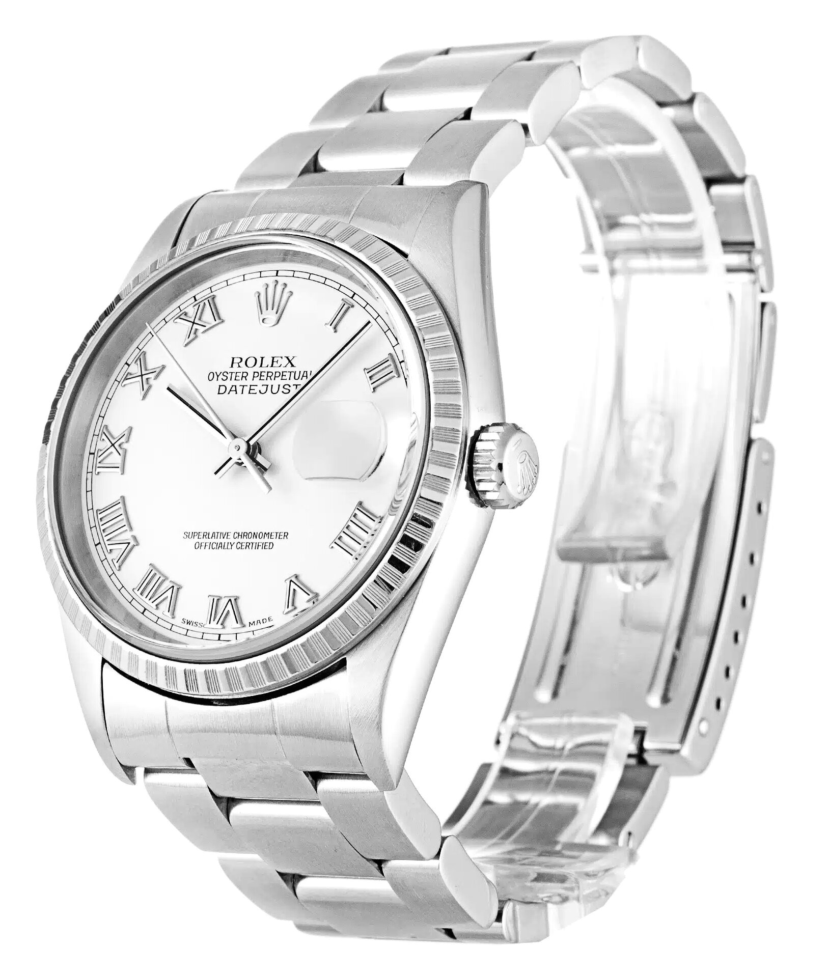 Die Rolex Datejust 16220 in dieser Ausführung kombiniert das puristische Stahlgehäuse mit dem eleganten Jubilee-Armband. Das weiße Zifferblatt und die glatte Lünette ergänzen den klassischen Look.