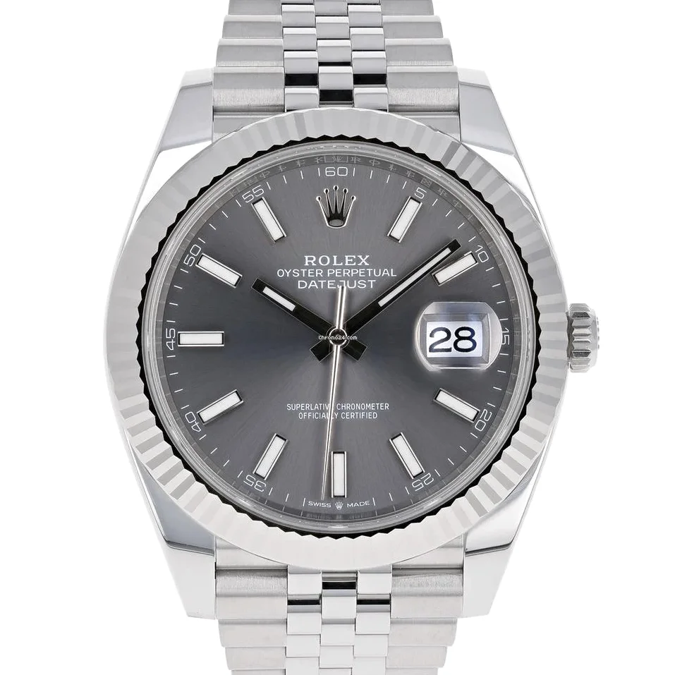 Die Rolex Datejust 126334 mit rhodiumfarbenem Zifferblatt und geriffelter Weißgold-Lünette zeigt die elegante Seite der 41mm-Kollektion. Oystersteel und 18 Karat Weißgold in markanter Größe.