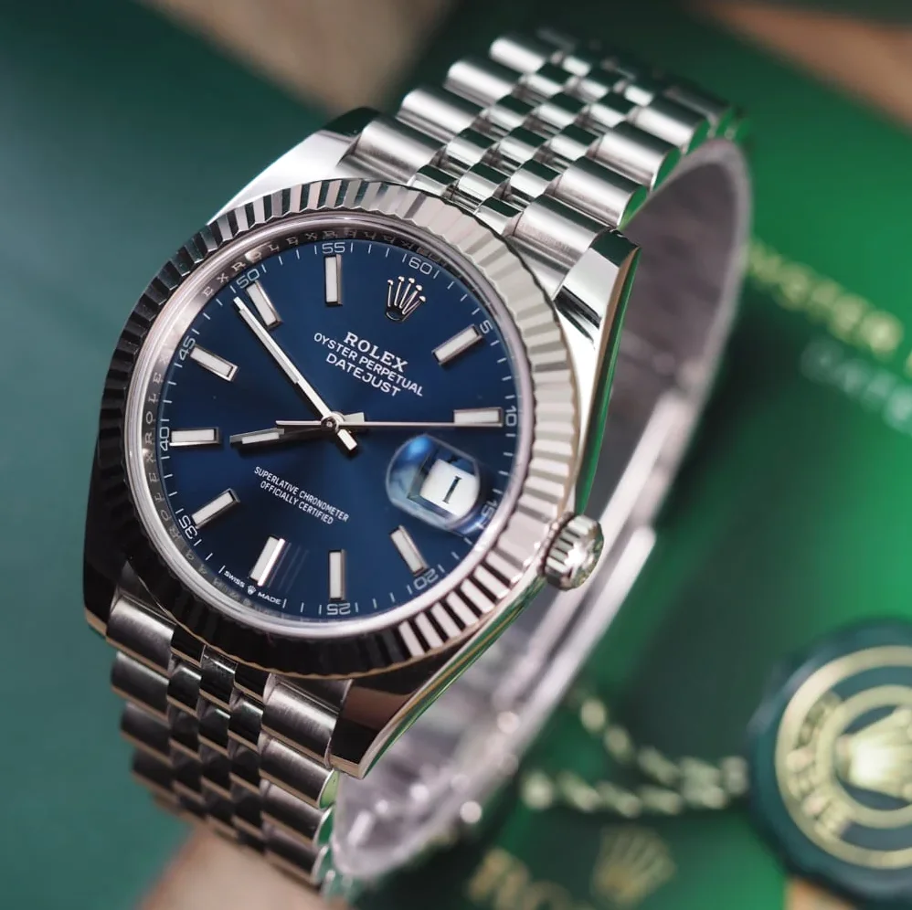 Die Rolex Datejust 126334 mit blauem Zifferblatt und Jubilee-Armband vereint lebendige Farbe mit klassischer Eleganz. Oystersteel und 18 Karat Weißgold-Lünette in 41mm Herrengröße.