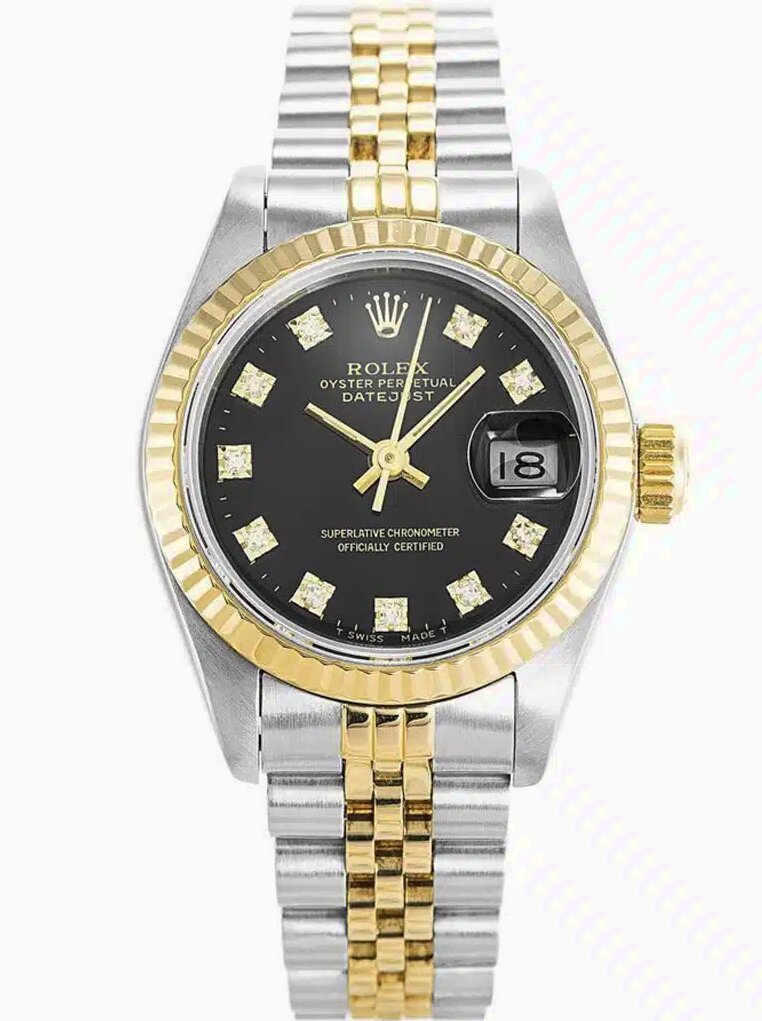 Mit der Datejust 69173 in Schwarz erhalten Sie eine Damenuhr, die auffällt ohne übertrieben zu wirken. Bicolor-Eleganz kombiniert mit einem kontraststarken Zifferblatt für selbstbewusste Auftritte.
