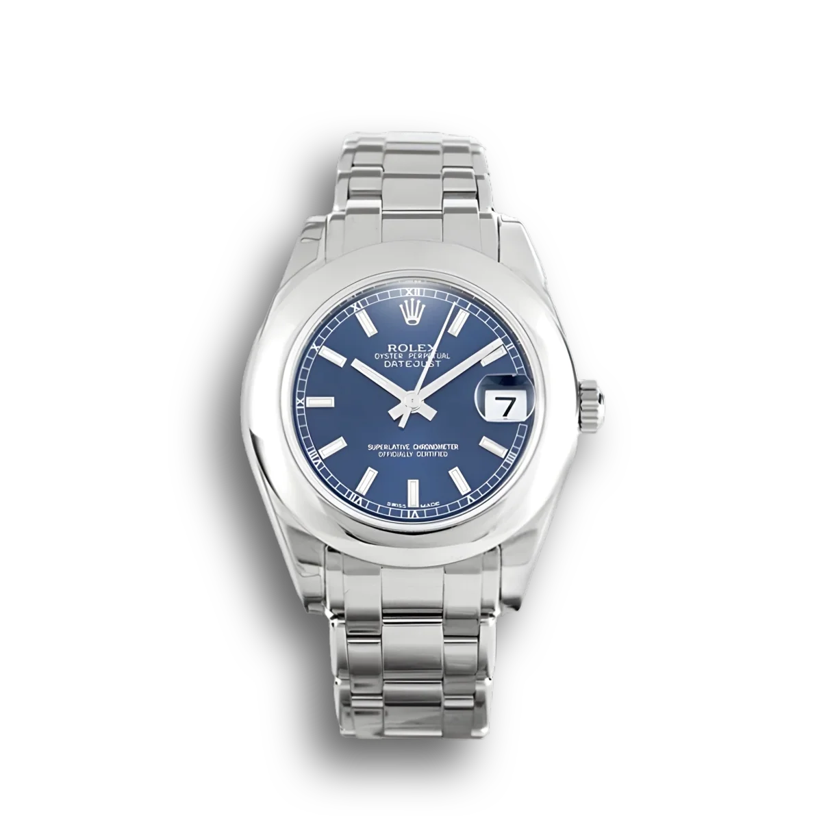 Die Rolex Datejust 81209 präsentiert sich komplett in 18 Karat Weißgold. Das blaue Zifferblatt setzt einen lebendigen Farbakzent zum kühlen Silberglanz des Weißgolds. Eine edle Kombination in der Mid-Size 31mm.