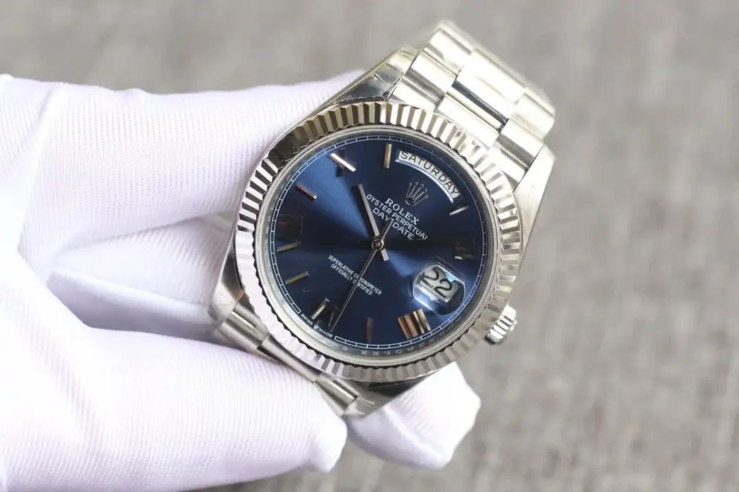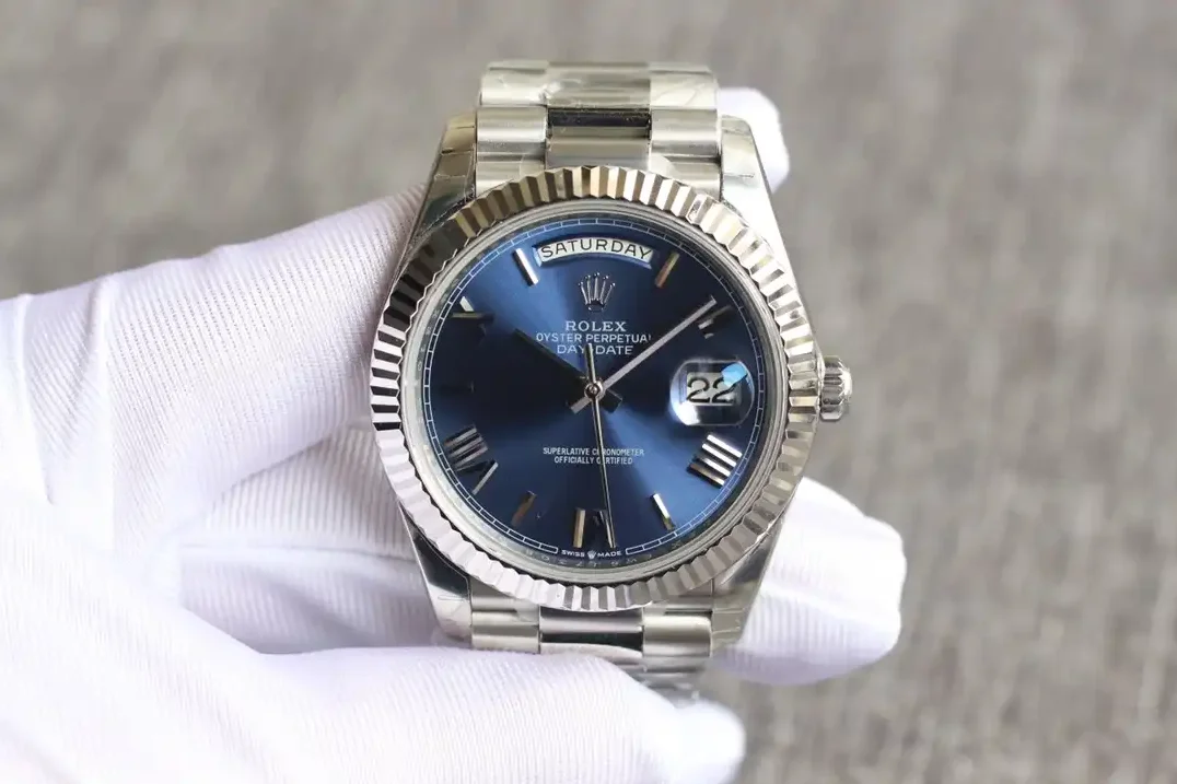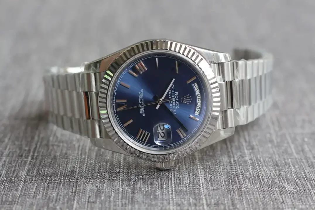 Die Rolex Day-Date 40 Referenz 126331 mit bright blauem Zifferblatt zeigt eine lebhafte Farbkombination. Das intensiv leuchtende Blau des Zifferblatts kontrastiert auffällig mit dem warmen Everose-Gold des 40mm-Gehäuses.