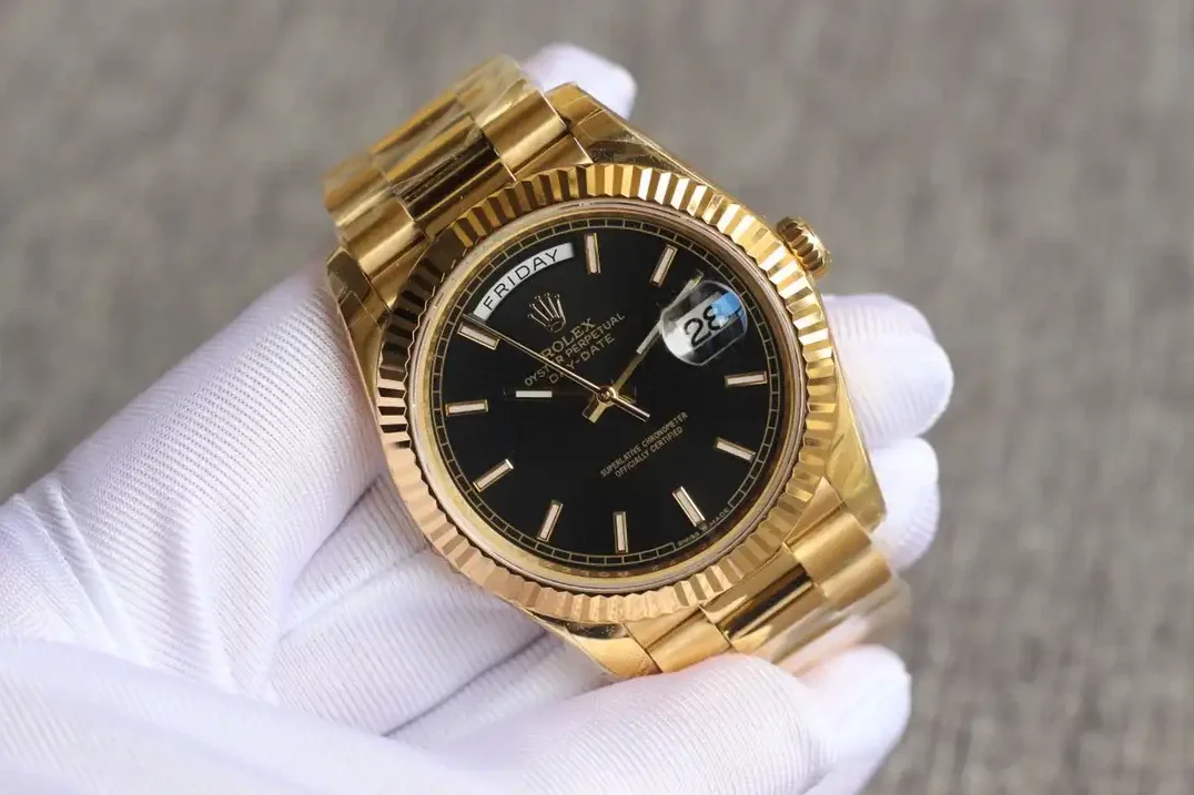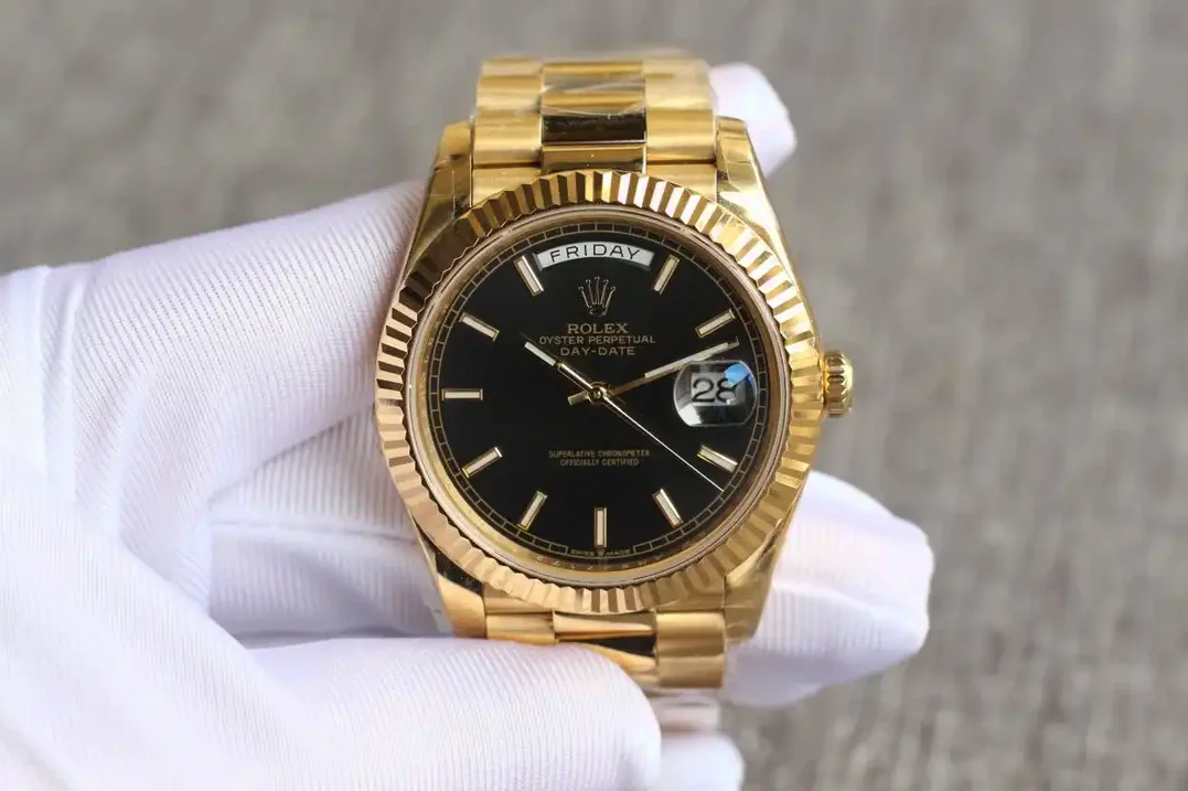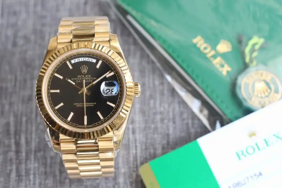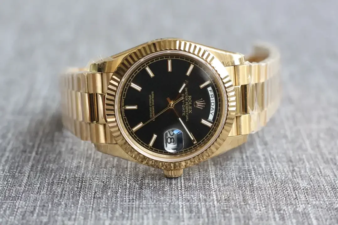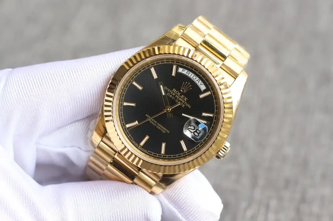 Die Rolex Day-Date 40 Referenz 126331 mit schwarzem Motif-Zifferblatt vereint dezente Eleganz mit dekorativem Design. Das gemusterte schwarze Zifferblatt bildet einen markanten Kontrast zum Everose-Gold des 40mm-Gehäuses.