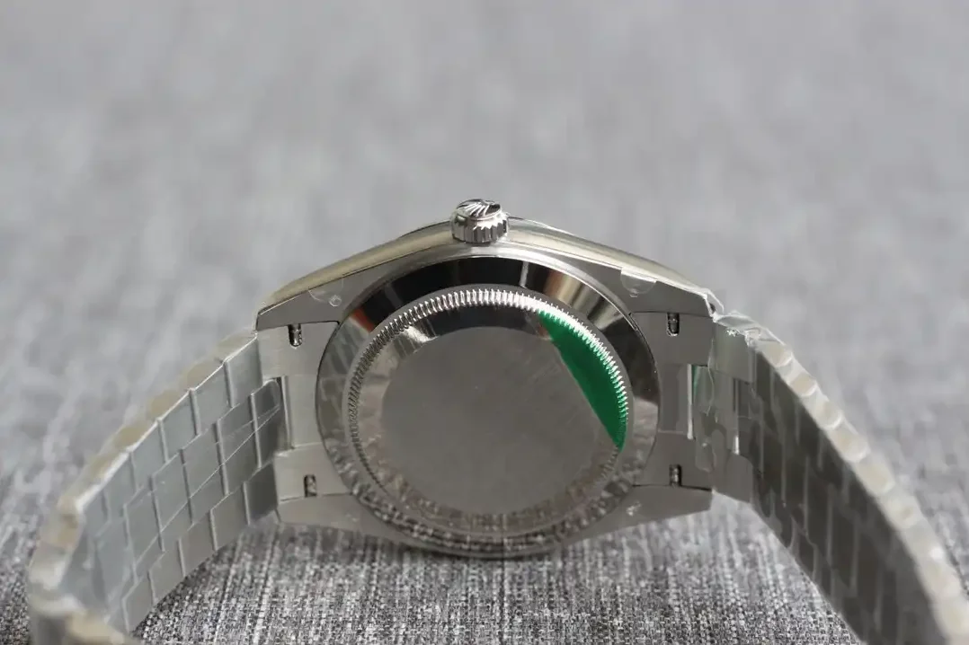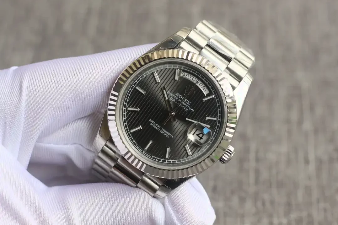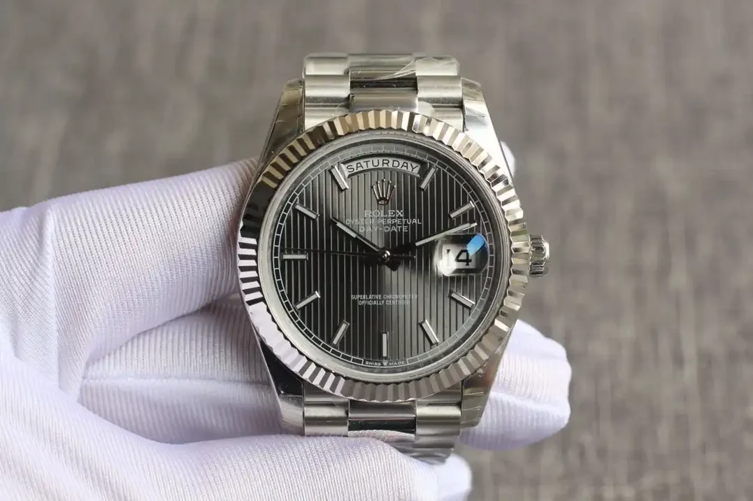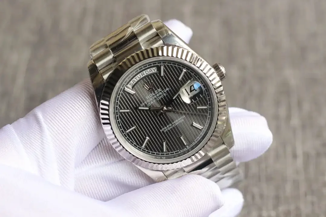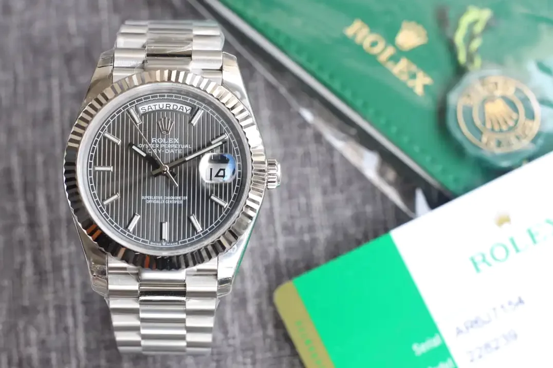 Die Rolex Day-Date 40 Referenz 126331 mit dunklem Rhodium-Streifenzifferblatt zeigt ein markantes Design. Die horizontalen Streifen auf dem Zifferblatt verleihen dieser Day-Date einen modernen, sportlichen Charakter. Das Everose-Gold des 40mm-Gehäuses ergänzt die dunklen Töne perfekt.