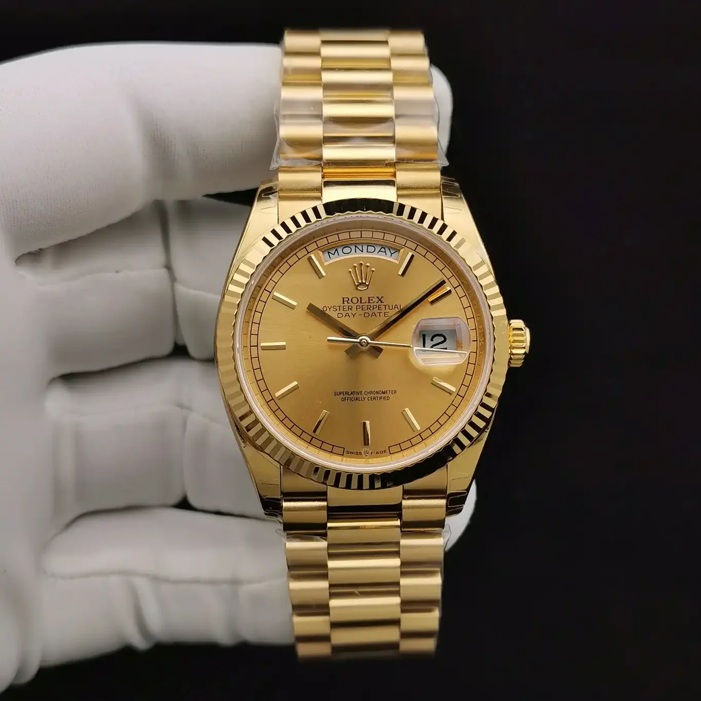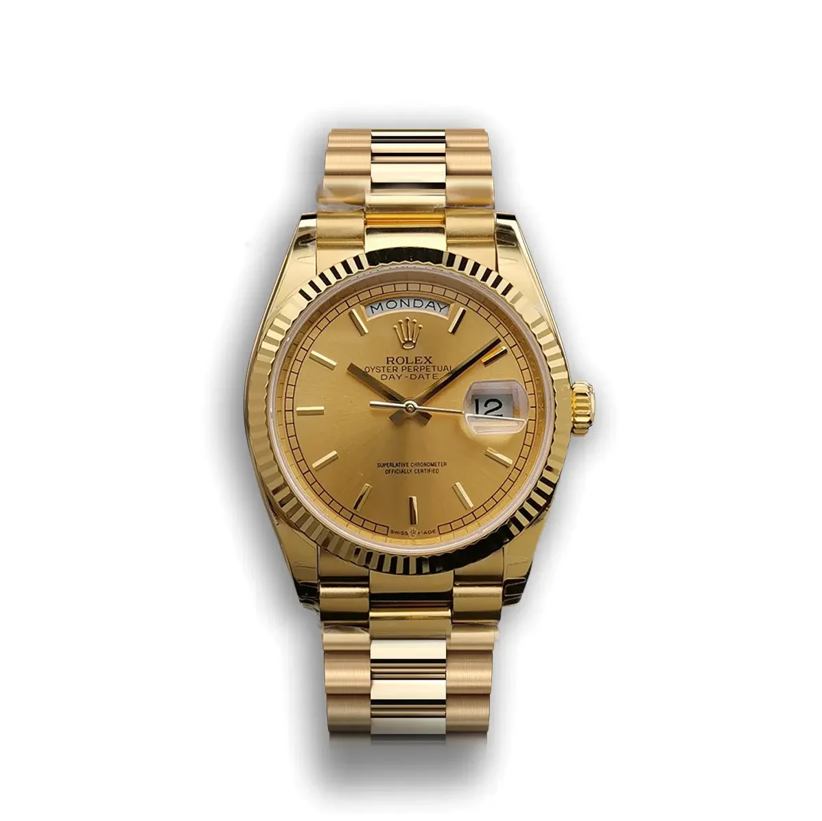 Die Rolex Day-Date 36 Referenz 128238 mit goldfarbenem Champagner-Zifferblatt präsentiert sich in durchgängiger Gelbgold-Optik. Das warme Champagner-Zifferblatt harmoniert perfekt mit dem 18-Karat-Gelbgold des 36mm-Gehäuses.