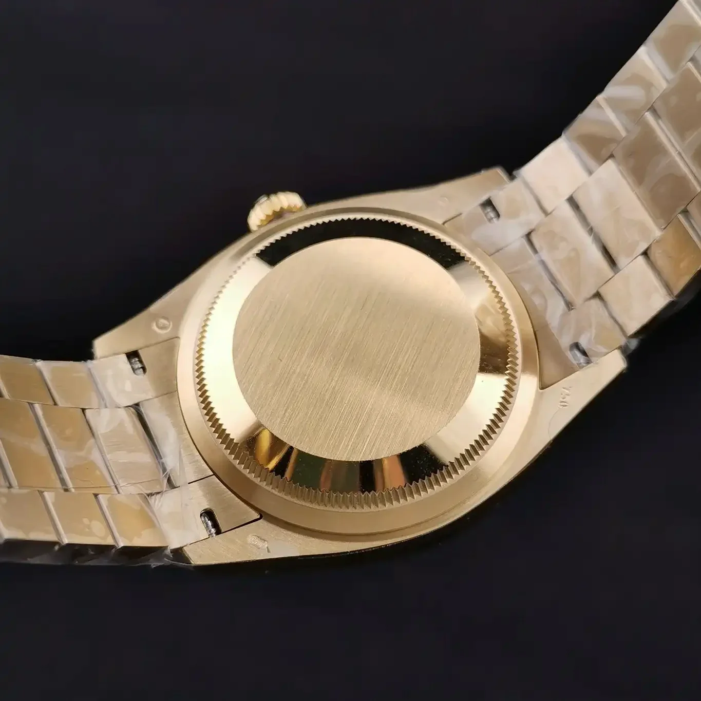 Das Präsident-Armband aus massivem Gelbgold mit halbkreisförmigen Gliedern ist das Markenzeichen der Day-Date. Die versteckte Kronenschließe sorgt für elegantes Design.