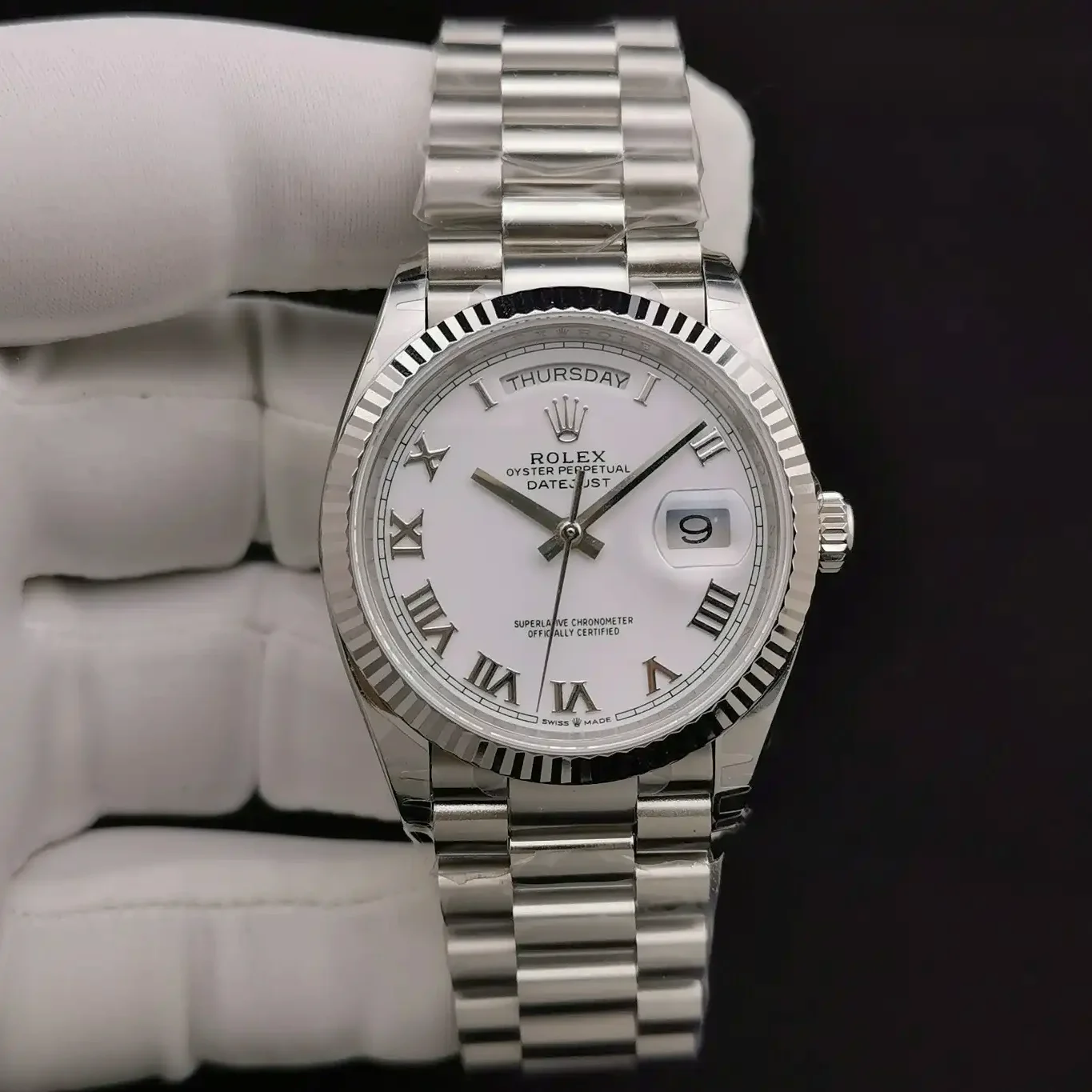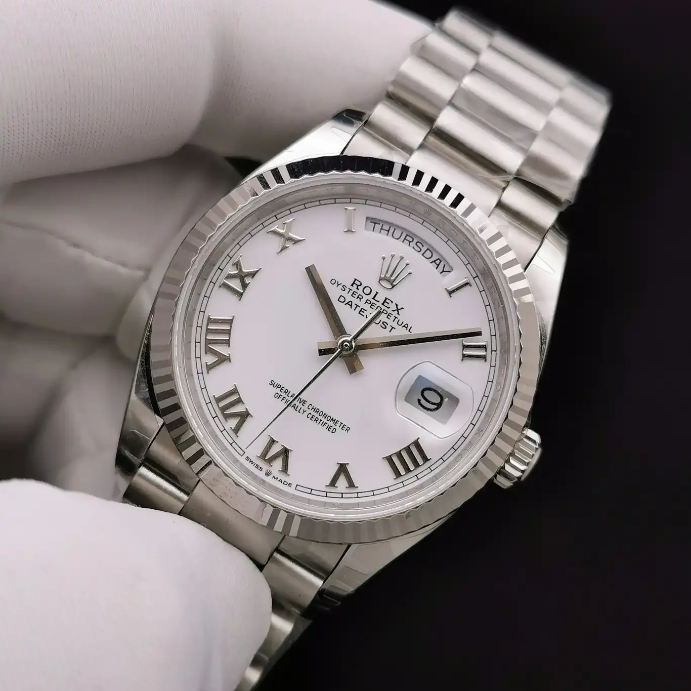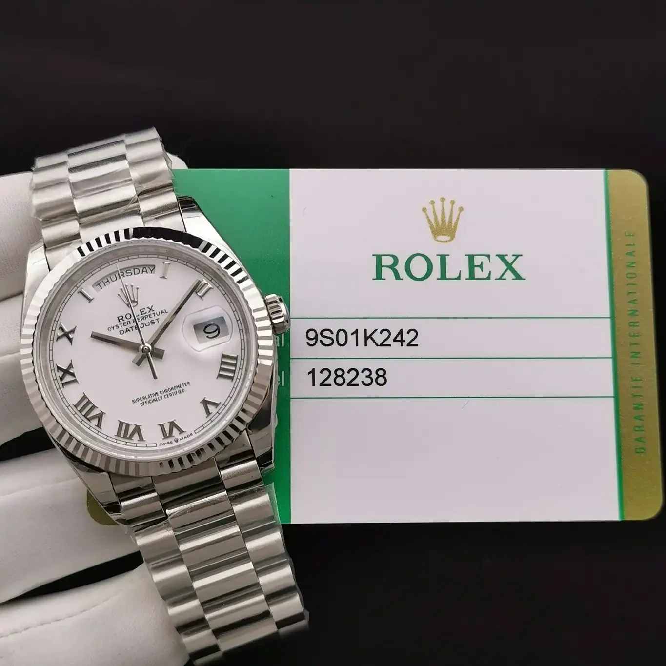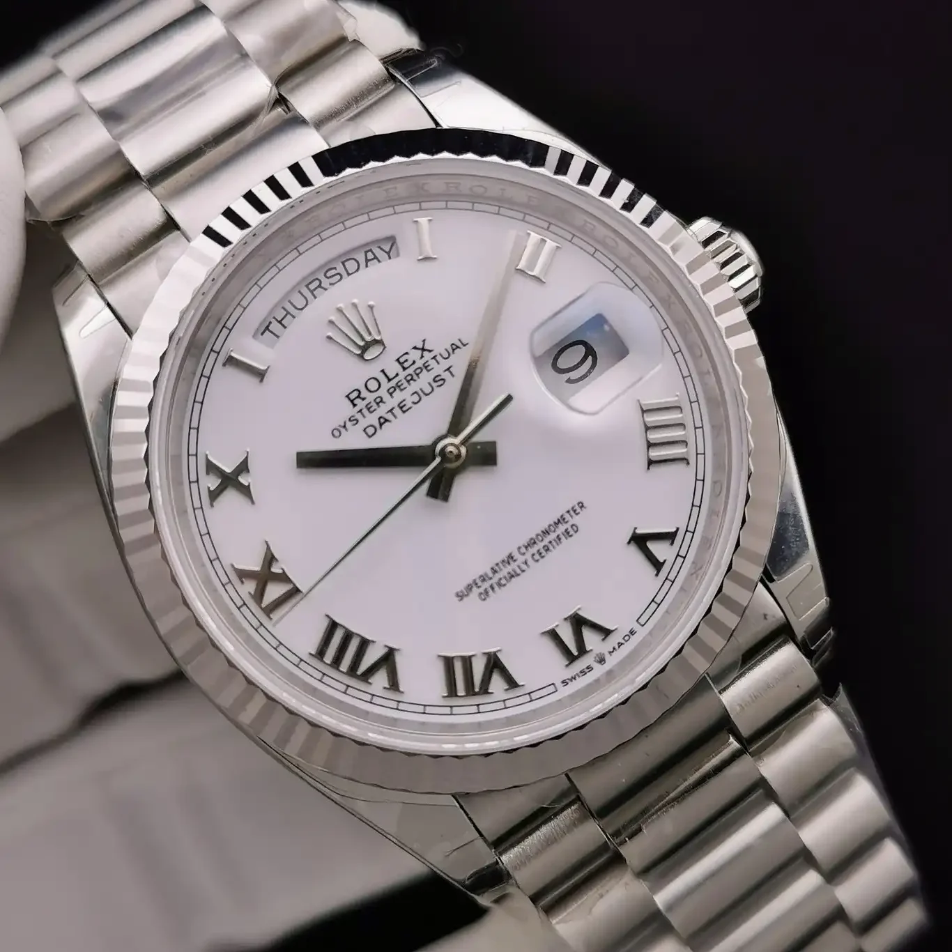 Die Rolex Day-Date 36 Referenz 128238 mit römischen Ziffern präsentiert die aktuelle Generation der Präsidentenuhr im klassischen 36mm-Format. Das Zifferblatt mit römischen Indexen verleiht dieser Day-Date einen traditionellen Charakter. Das Gehäuse besteht aus 18 Karat Gelbgold.
