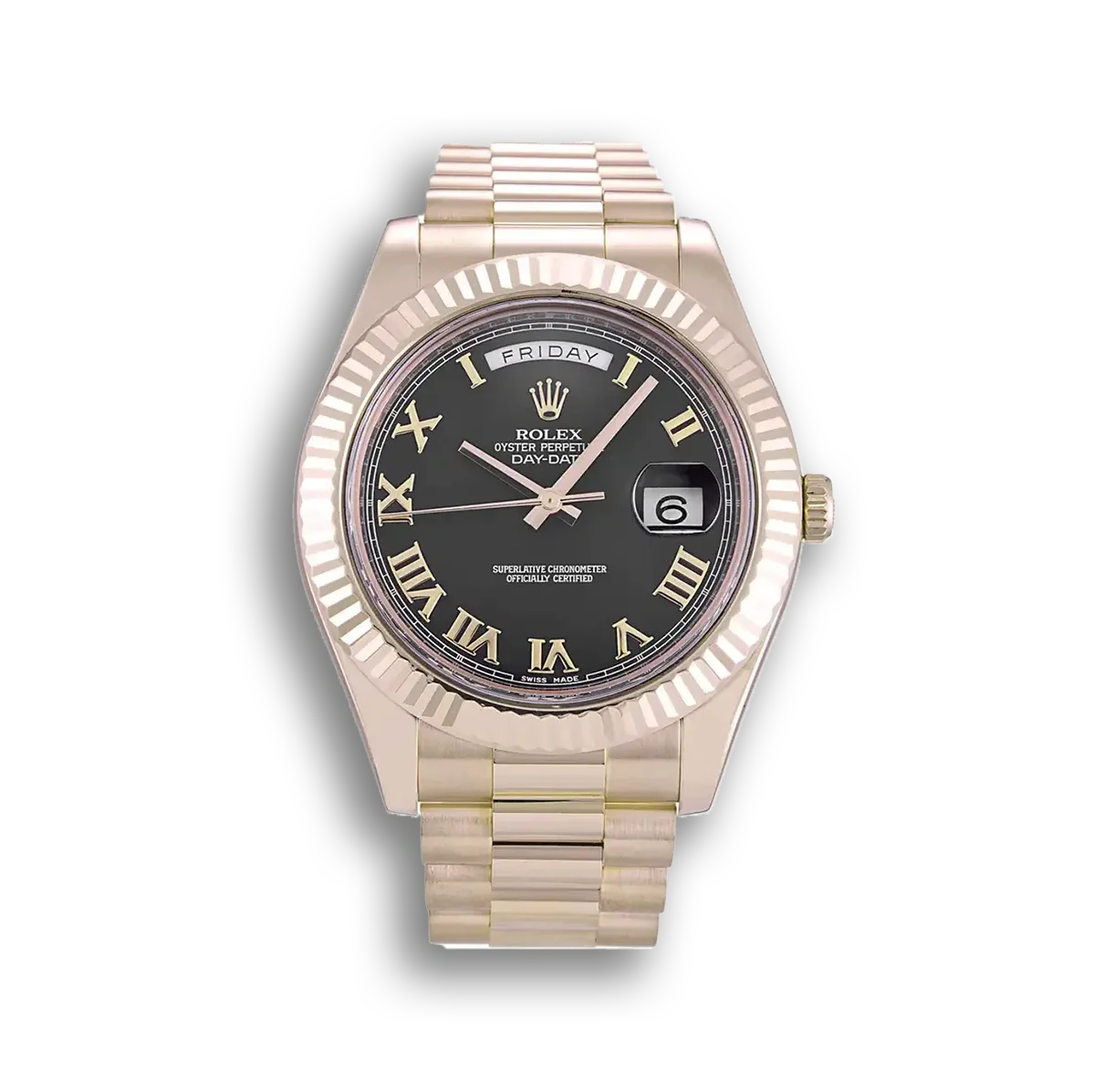 Die geriffelte Lünette aus Everose-Gold umrahmt das Zifferblatt mit vertikalen Rillen. Das Präsident-Armband besteht ebenfalls aus massivem Everose-Gold mit der charakteristischen versteckten Kronenschließe.