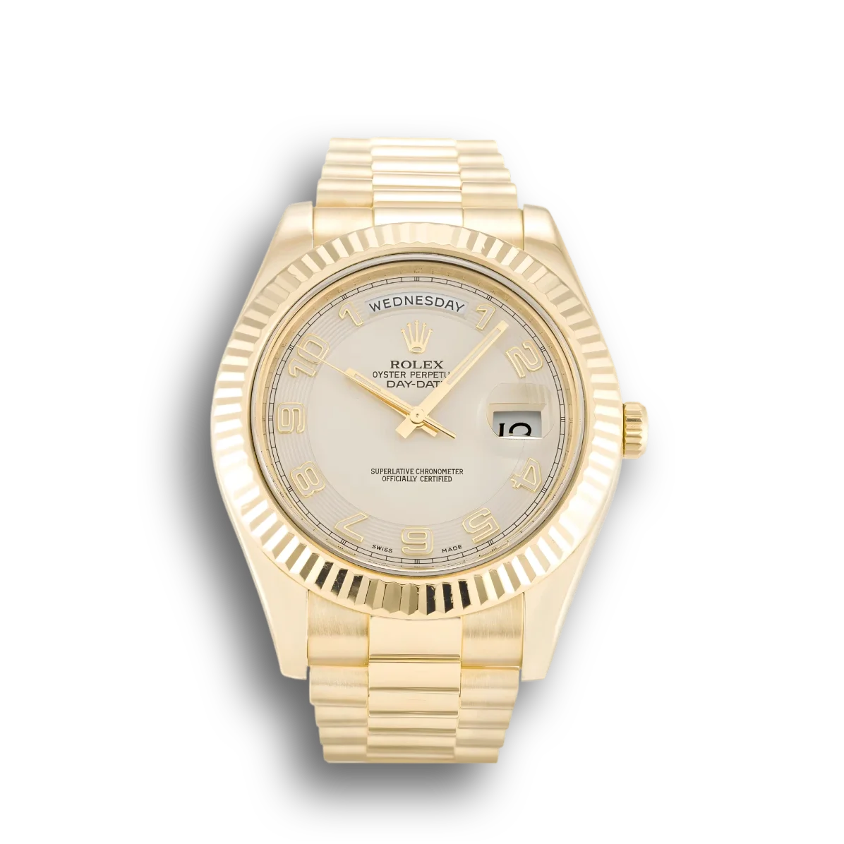 Die Rolex Day-Date II 218238 präsentiert das größere 41mm-Format in klassischem 18-Karat-Gelbgold. Das elfenbeinfarbene Zifferblatt strahlt Wärme aus und harmoniert perfekt mit dem Goldgehäuse. Diese Referenz verbindet traditionelle Day-Date-Werte mit zeitgemäßen Proportionen.