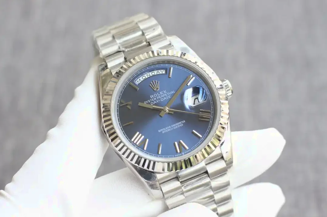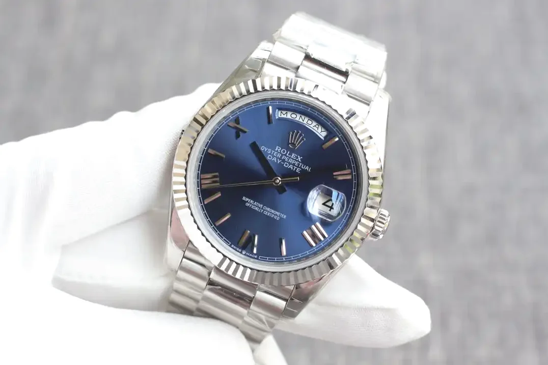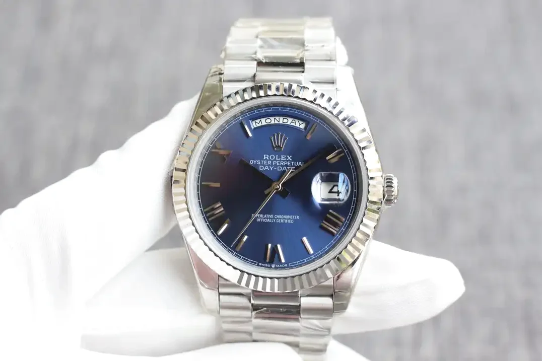 Die Rolex Day-Date 40 Referenz m228238 mit bright blauem Zifferblatt zeigt ein intensiv leuchtendes Blau. Das lebhafte Zifferblatt kontrastiert markant mit dem 18-Karat-Gelbgold des 40mm-Gehäuses und sorgt für einen auffälligen Auftritt.