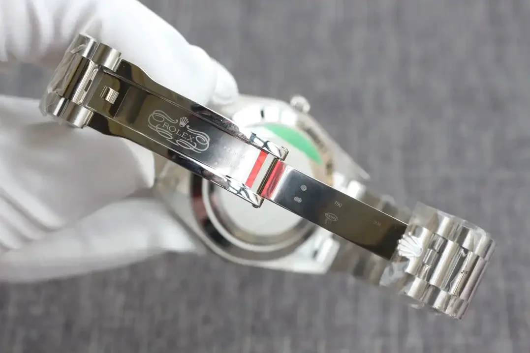 Das Präsident-Armband aus massivem Gelbgold mit halbkreisförmigen Gliedern ist das Markenzeichen der Day-Date. Die versteckte Kronenschließe sorgt für elegantes Design.