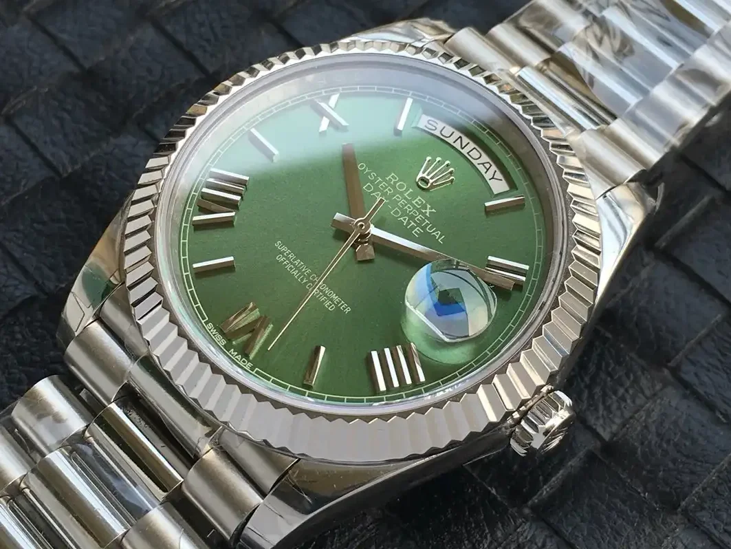 Die Rolex Day-Date 40 Referenz m228238 mit grünem Zifferblatt zeigt eine begehrte Farbkombination. Das satte Grün des Zifferblatts kontrastiert elegant mit dem warmen 18-Karat-Gelbgold des 40mm-Gehäuses. Diese Farbwahl gehört zu den beliebtesten Optionen der aktuellen Day-Date.