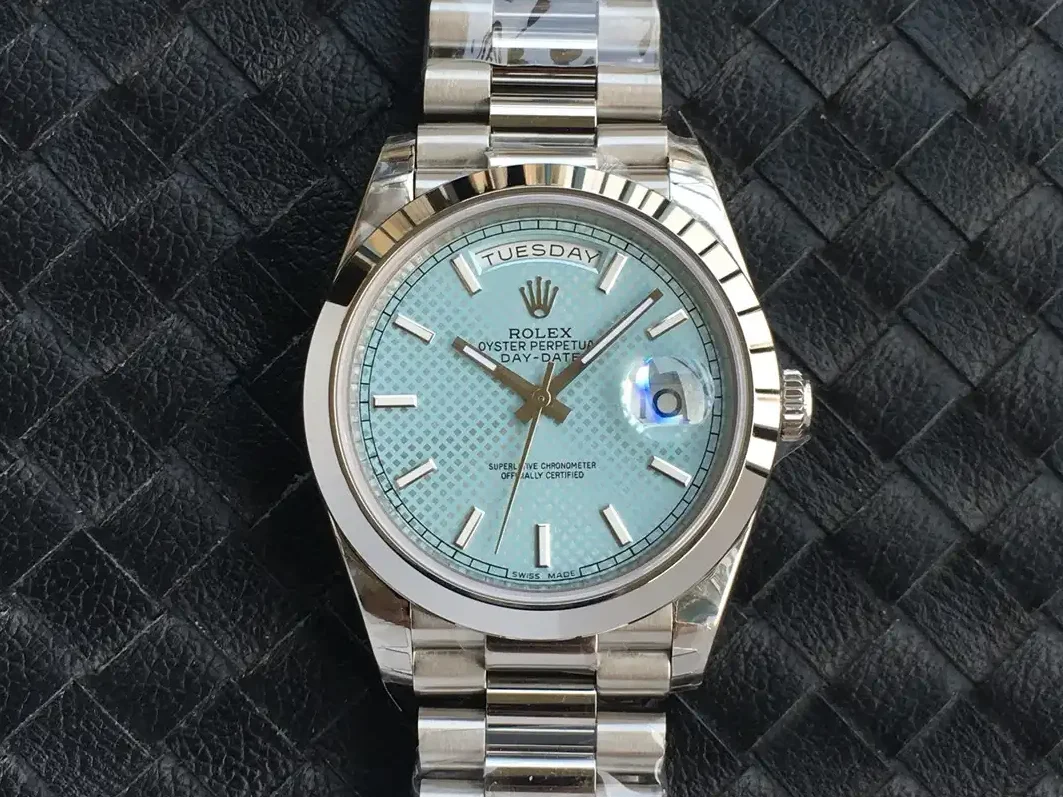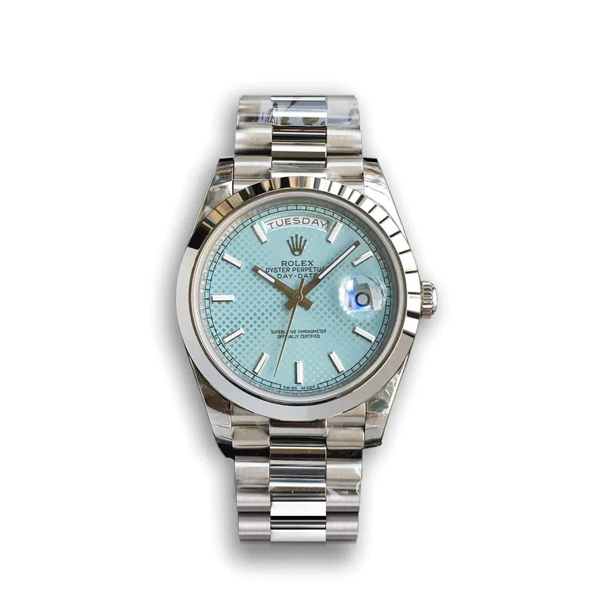 Die Rolex Day-Date 40 Referenz m228238 mit eisblauem Motif-Zifferblatt zeigt eine außergewöhnliche Farbkombination. Das dekorative eisblau gemusterte Zifferblatt kontrastiert ungewöhnlich mit dem warmen 18-Karat-Gelbgold des 40mm-Gehäuses.
