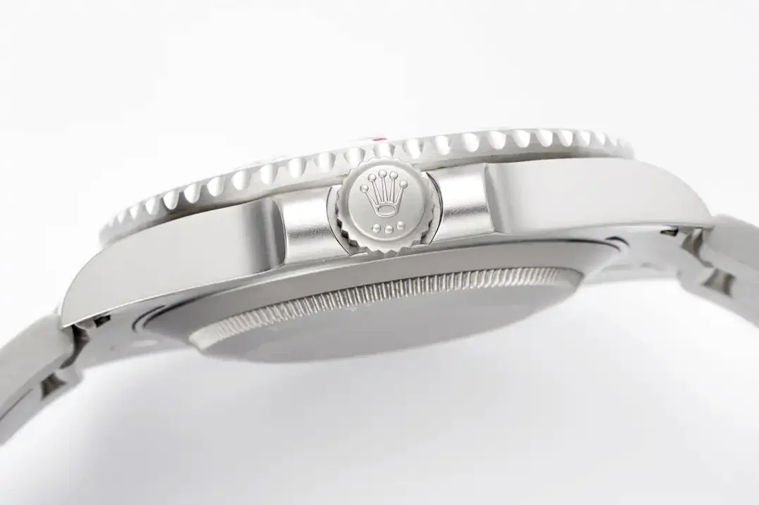 Mit 41mm Durchmesser prasentiert sich diese Submariner selbstbewusst und sportlich. Die Keramikluenette ist kratzfest und behaelt ihre intensive Farbe dauerhaft. Die massiven Bandanstoesse und die verschraubte Krone unterstreichen den professionellen Charakter dieser Taucheruhr.