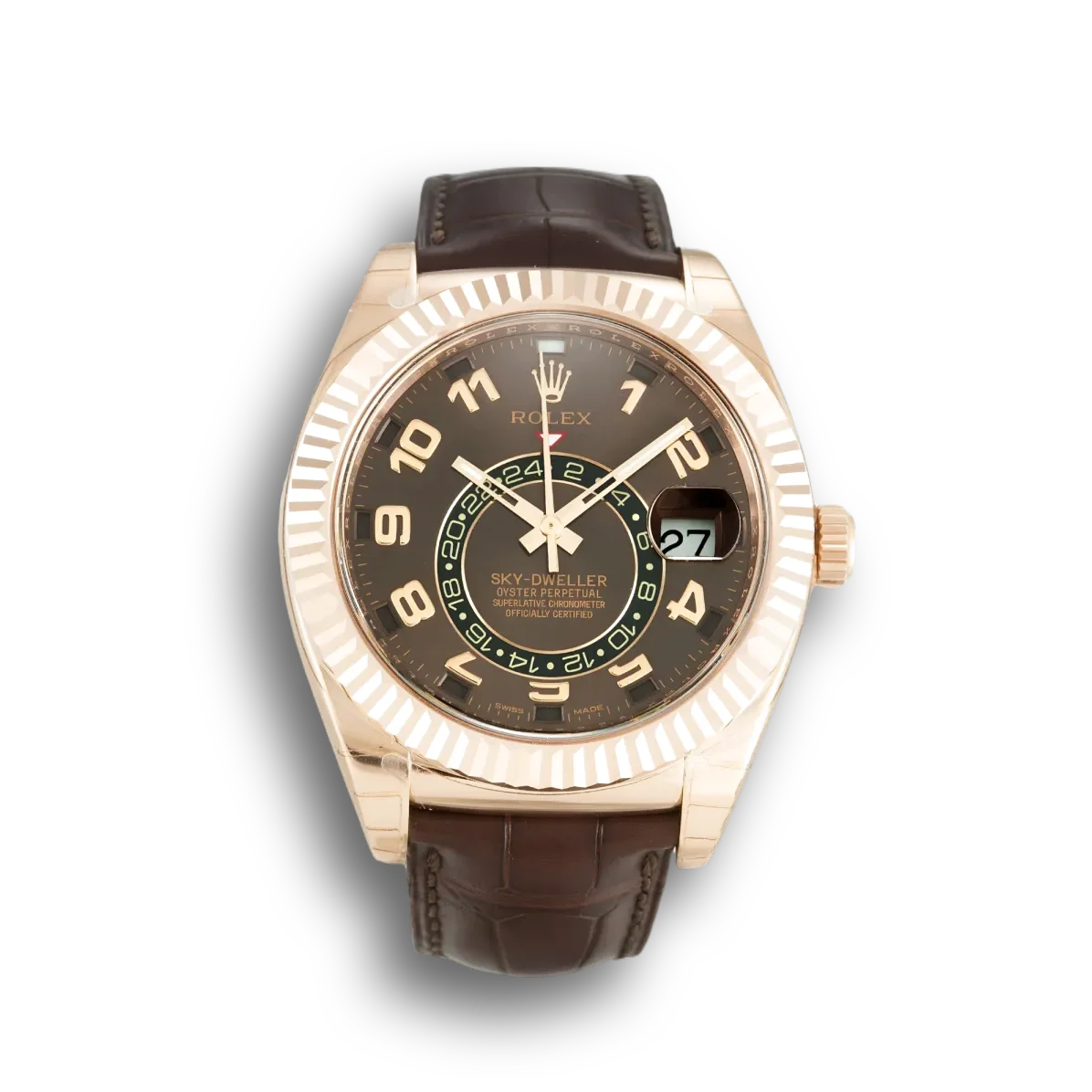 Die Rolex Sky-Dweller 326135 in 18K Everose-Gold besticht durch ihr warmes braunes Zifferblatt. Das schokoladenbraune Sonnenschliff-Finish harmoniert perfekt mit dem roséfarbenen Goldgehäuse.