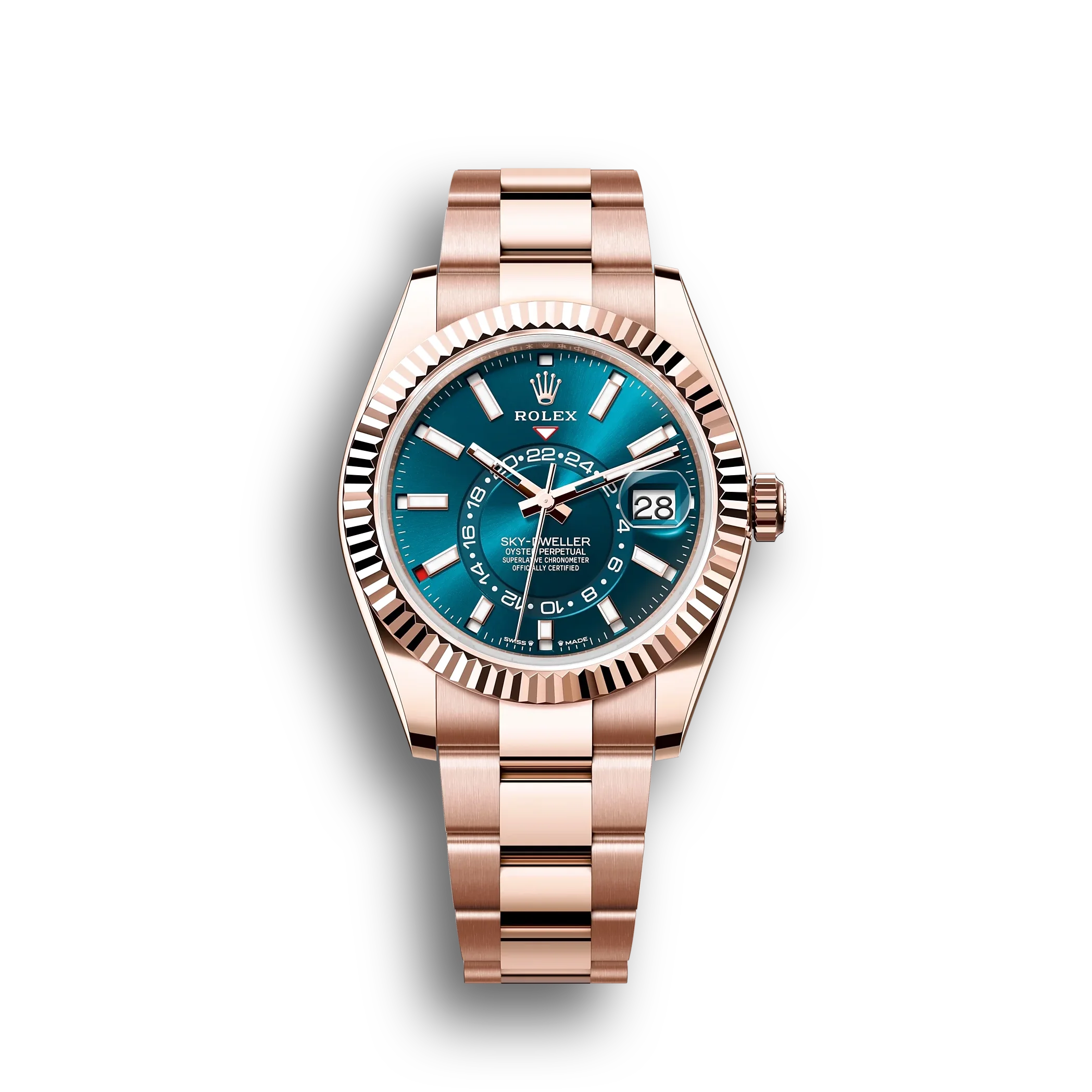 Die Rolex Sky-Dweller 326935 mit blaugrünem Zifferblatt ist eine seltene Farbvariante in Rolesor Everose. Das changierente Zifferblatt zeigt je nach Lichteinfall unterschiedliche Farbnuancen.