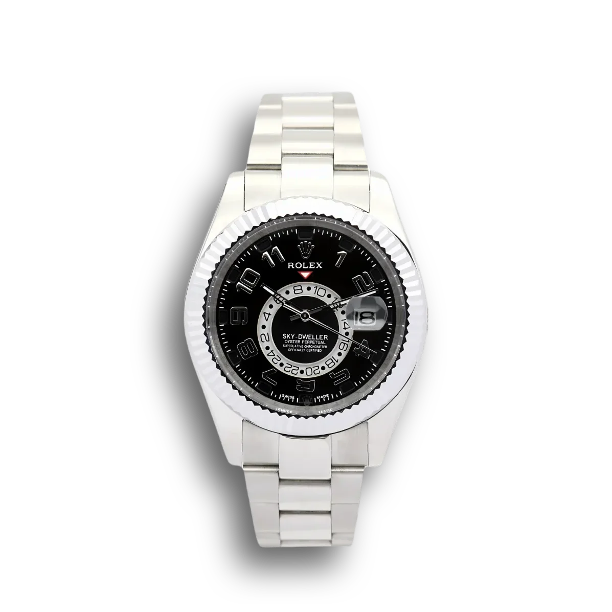 Die Rolex Sky-Dweller 326938 kombiniert ein Gelbgoldgehäuse mit schwarzem Zifferblatt für maximalen Kontrast. Das mattschwarze Finish mit goldenen Indizes und Zeigern erzeugt eine markante, maskuline Optik.