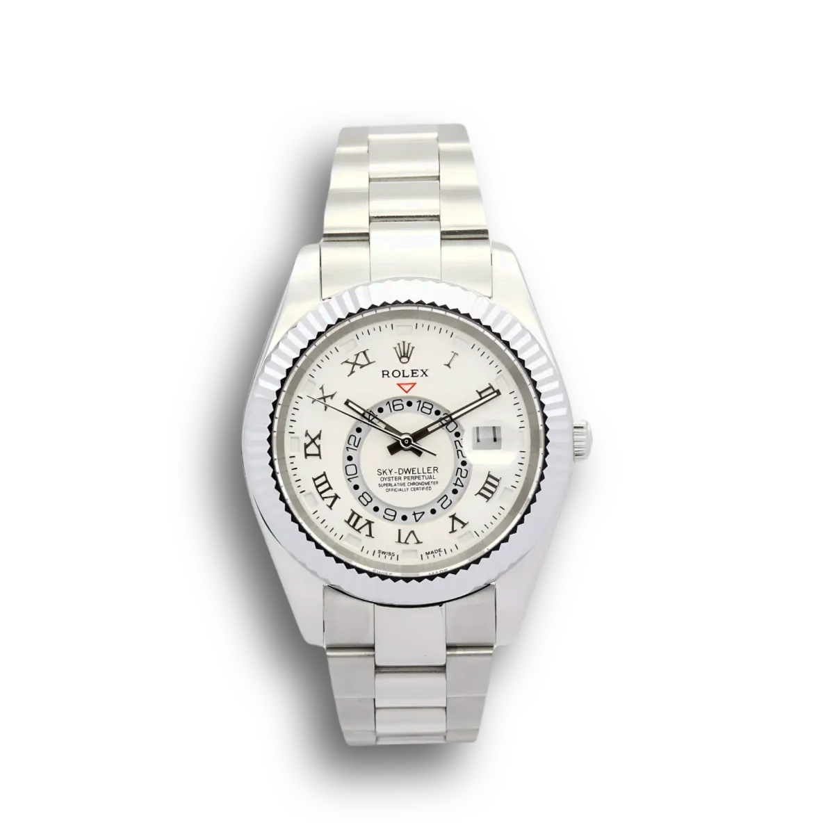 Die Rolex Sky-Dweller 326938 mit weißem Zifferblatt und Gelbgoldgehäuse verkörpert klassische Eleganz. Das reinweiße Zifferblatt mit goldenen Indizes bietet hervorragende Ablesbarkeit bei jedem Licht.