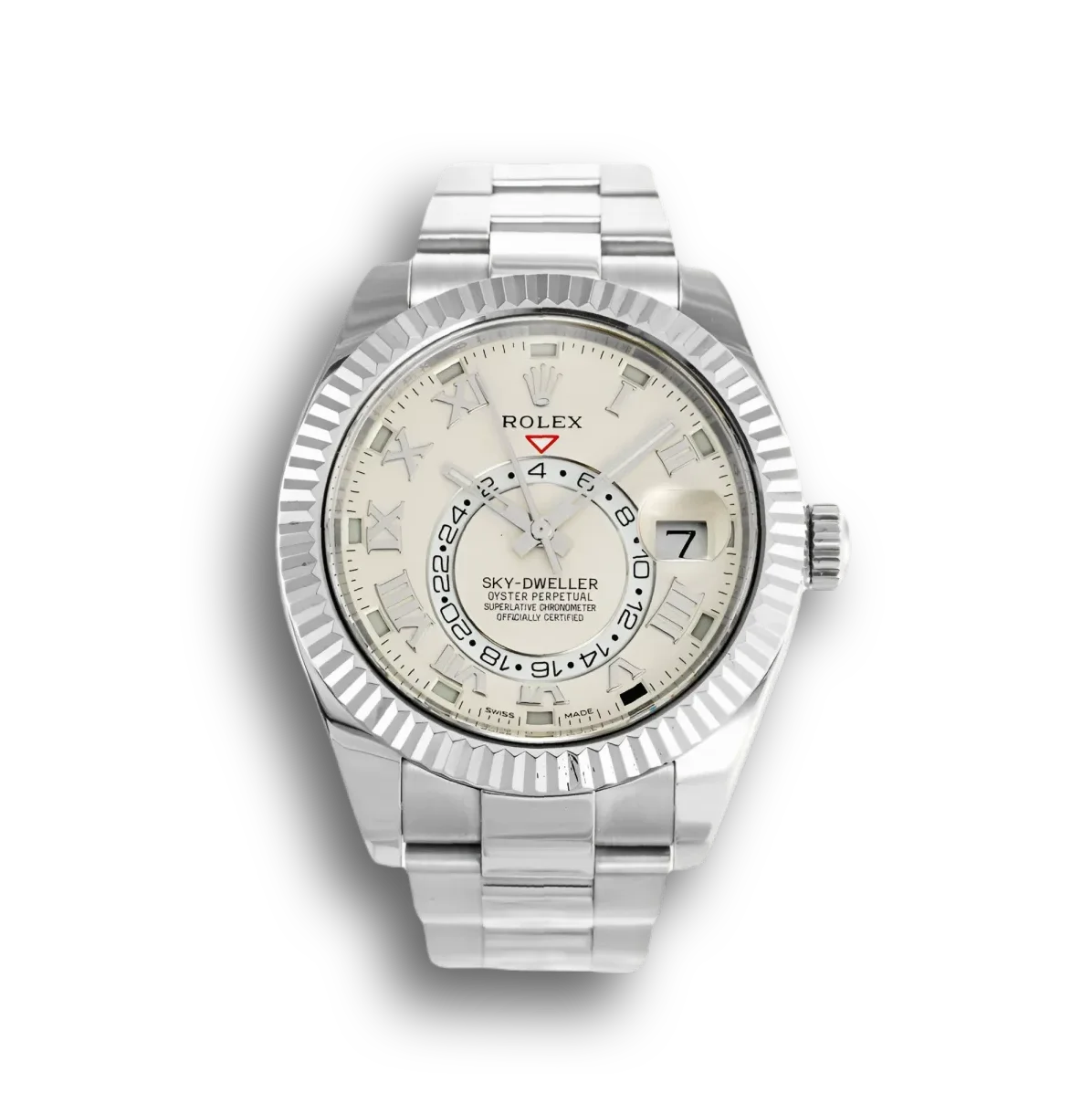 Die Rolex Sky-Dweller 326939 präsentiert sich in massivem 18 Karat Weißgold mit silbernem Zifferblatt. Die Kombination aus kühlem Weißgold und silbernem Sonnenschliff-Finish erzeugt eine dezent luxuriöse Ästhetik.