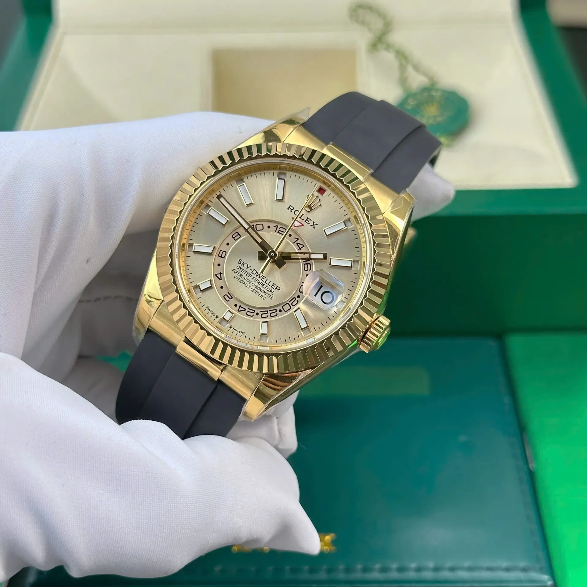 Die Rolex Sky-Dweller 336238 der aktuellen Generation präsentiert ein Champagner-Zifferblatt im 18K Gelbgoldgehäuse. Der warme Farbton des Zifferblatts harmoniert perfekt mit dem klassischen Rolex-Gold.